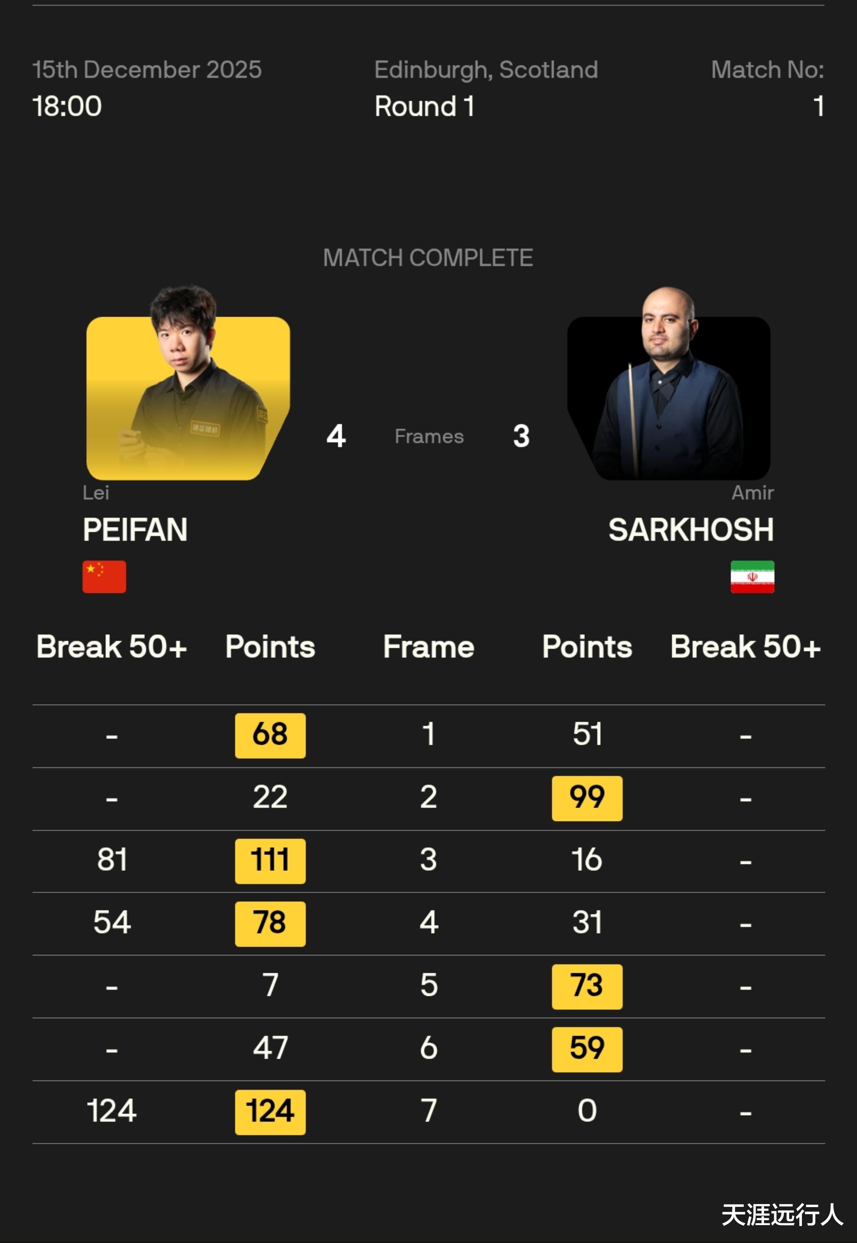 雷佩凡开场先拔头筹,萨克霍什扳回一城,雷震子打出两杆单杆50+连胜两局,先达赛点,伊朗二哥再追两分,抹平赛点,决胜局,雷佩凡轰单杆124分破百,锁定胜利。