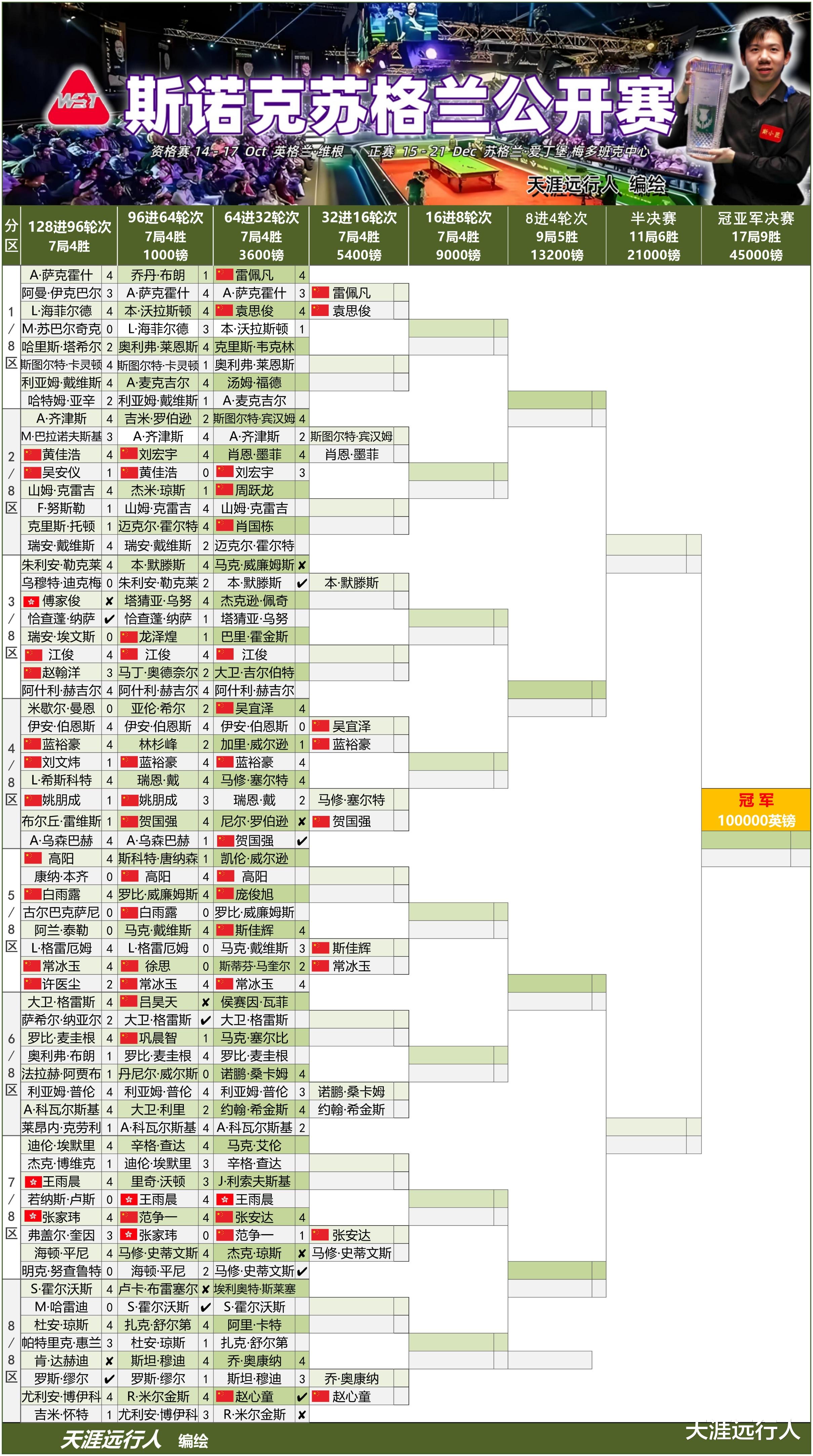 2025斯诺克苏格兰最新进程签表,一张表看苏格兰公开赛全程,请收藏转发,以备不时之需。