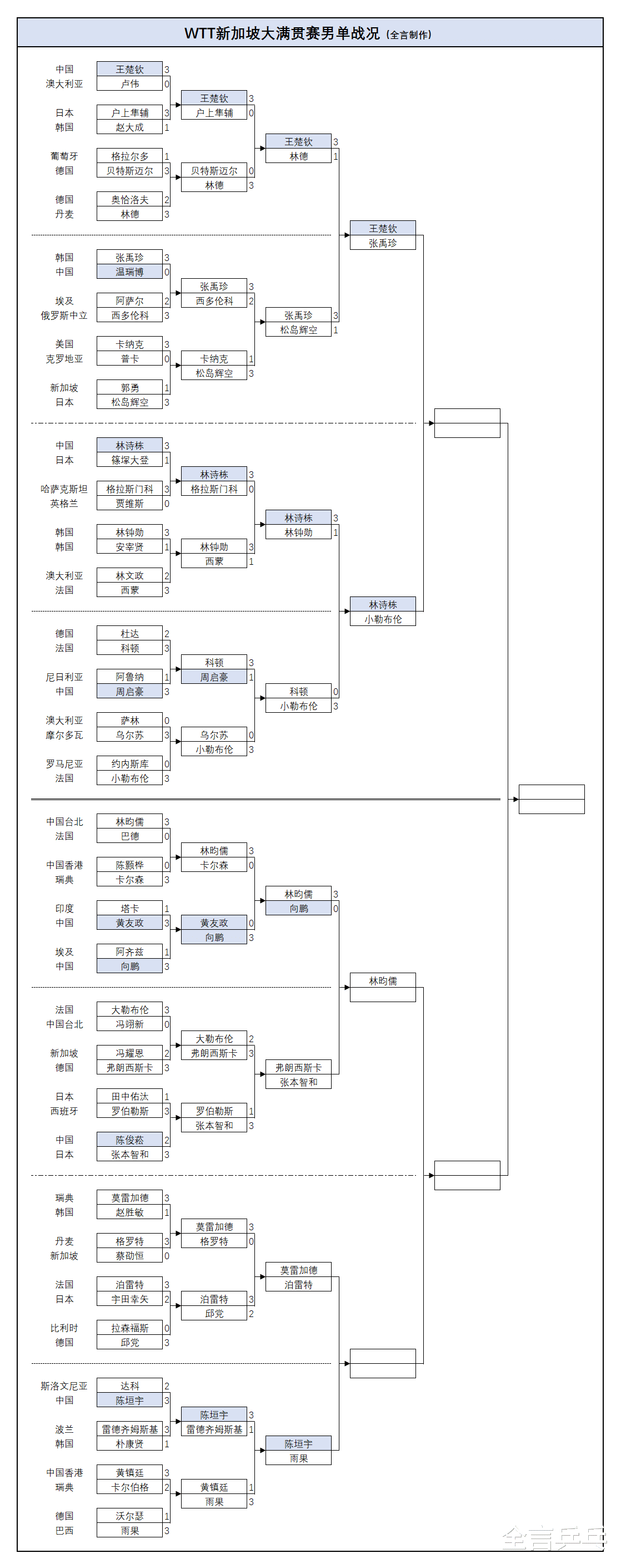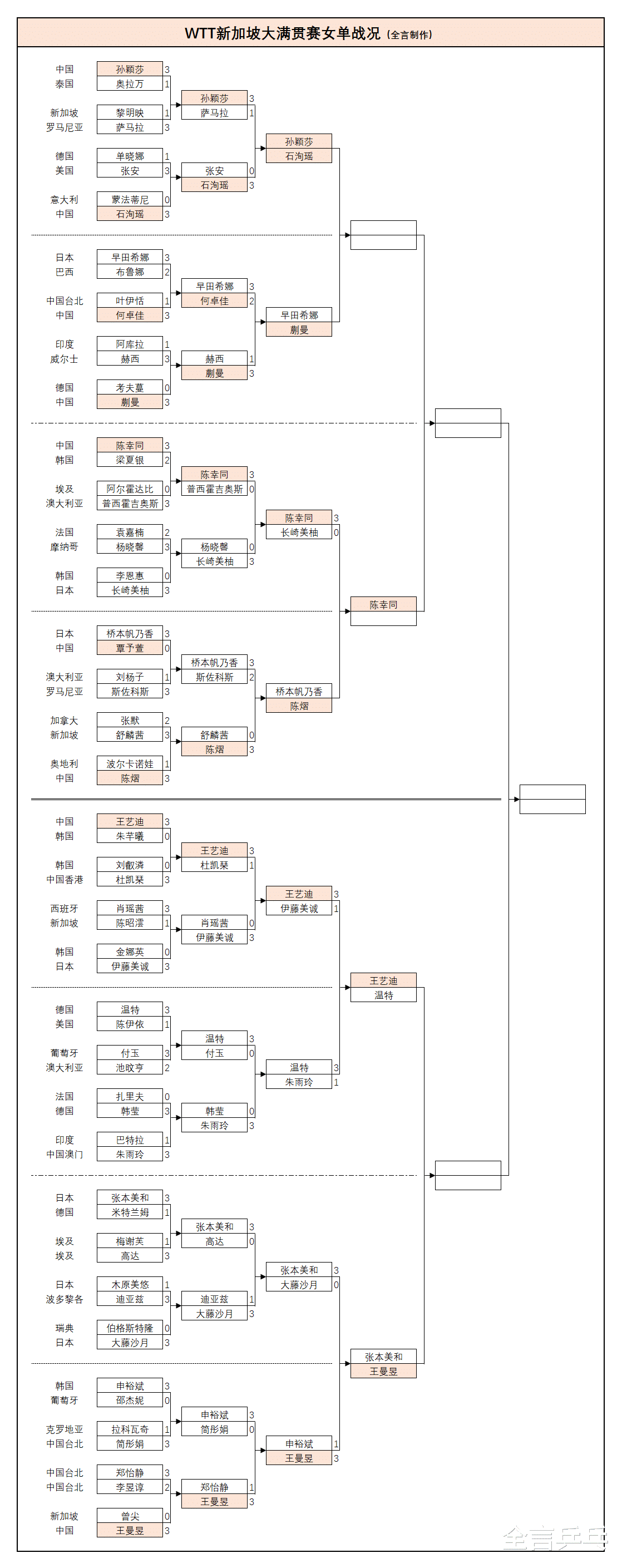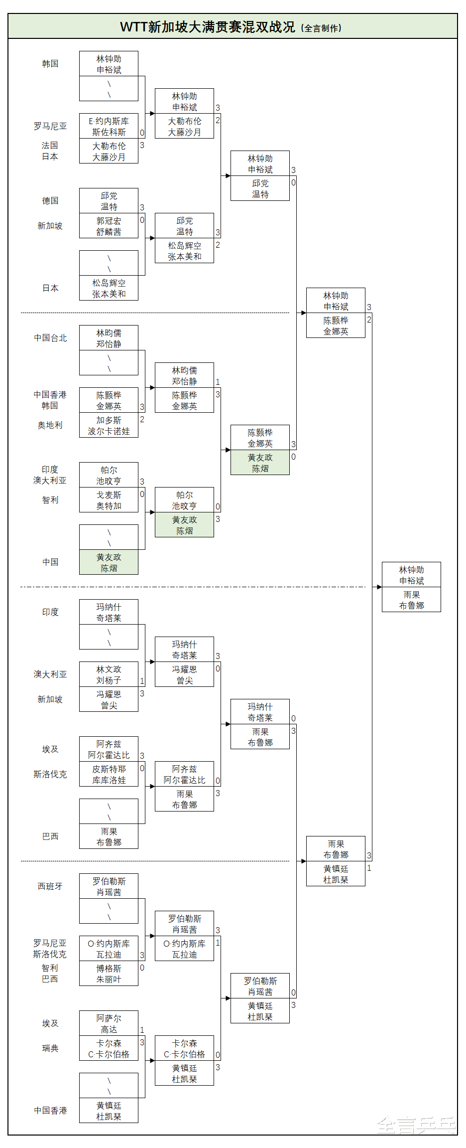 目前混双、女双决赛名单已经出炉,由韩国的林钟勋/申裕斌对阵巴西的雨果/布鲁娜、日本的张本美和/早田希娜迎战申裕斌(韩国)/长崎美柚(日本)——三项双打战况如下: