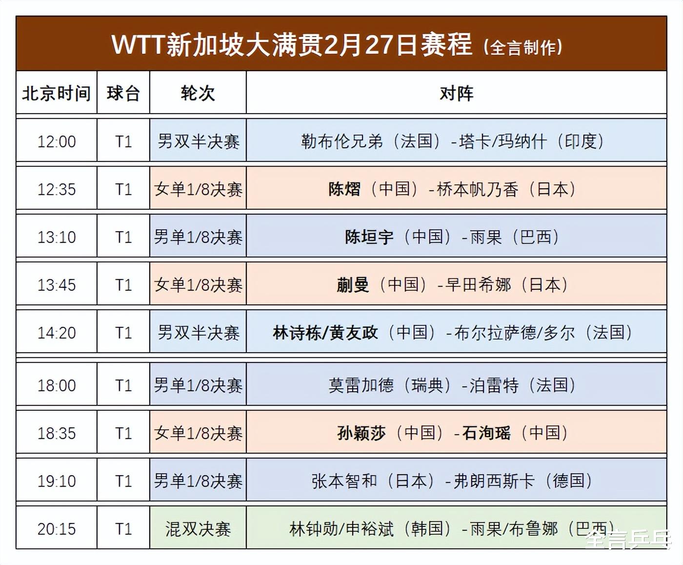 2026年2月27日,乒乓球WTT新加坡大满贯赛即将开启正赛第6天的对决,目前国乒单打已有7位运动员被淘汰,5人率先晋级8强,5人尚未在第三轮登场;混双、女双已经败北确定无缘登顶,男双闯入半决赛继续保留夺冠的希望。