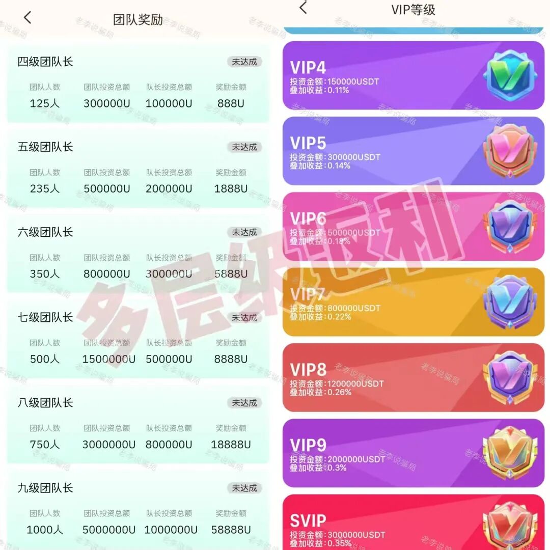 因此,为了维持,平台只得鼓励拉新,根据投资金额和团队人数划分等级,依据等级发放奖励金和叠加收益。该模式实属借新还旧的庞氏骗局套路。
