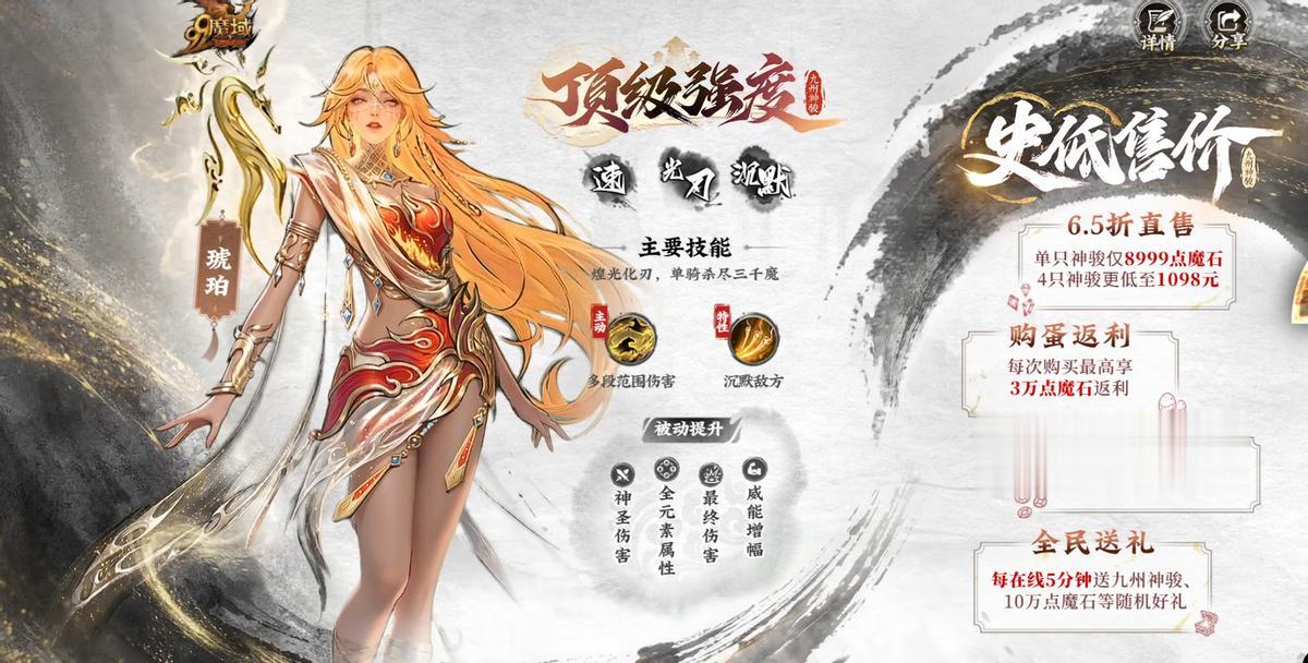 先来看大家最关心的价格。从1月23日维护后开始,一直到2月24日24点,“九州神骏”系列礼包将开启限时直售,而且直接给到6.5折!往年单只马年幻兽的原价是13888点魔石,这次活动期间,单只神骏只需要8999点魔石就能带走。