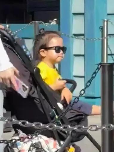 李承铉身穿黑白条纹衬衫和黑色长裤,打扮帅气有型,推着婴儿车奶爸范十足。儿子戴着墨镜,身穿黄色t恤,看起来十分可爱。李承铉推着坐婴儿车的儿子,戚薇和女儿跟随在旁边,画面十分温馨。
