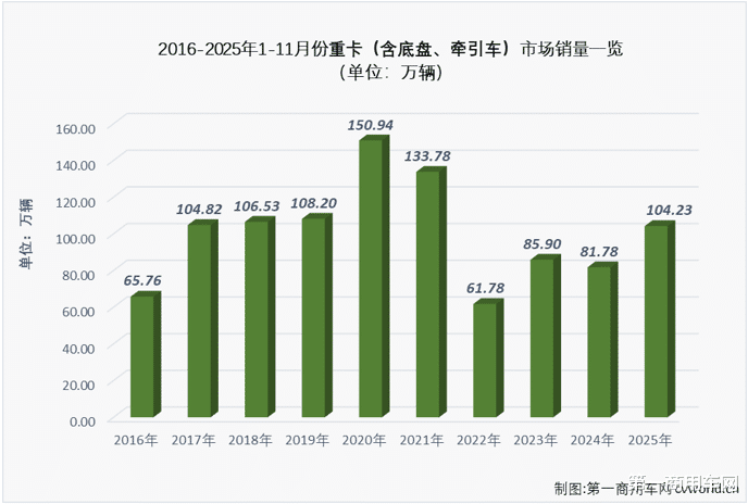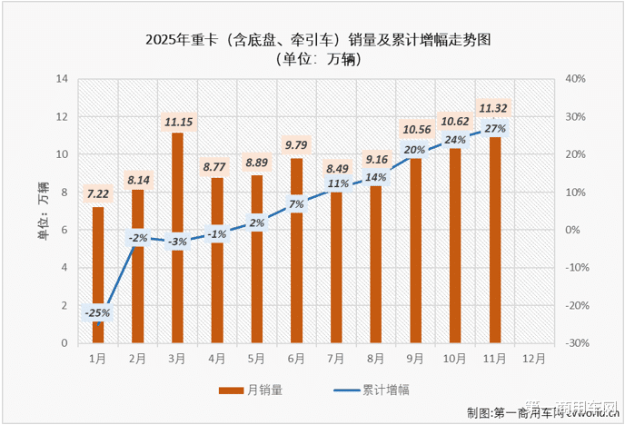 2025年11月份重卡市场同比增长65%,同比增幅较上月(+60%)扩大5个百分点,比2024年11月份多销售约4.5万辆。