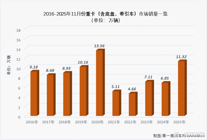 2025年11月份,重卡市场销售11.32万辆,同比大增65%,表现比“金九银十”还要亮眼。2025年还有最后1个月,全年销量突破110万辆已经没有悬念,最终会达到多少呢?
