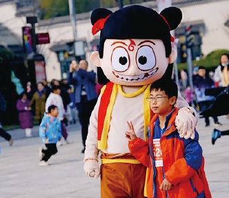 9时30分,活动尚未开始,广场上早已人头攒动。家住西影路的张先生说:“这场活动既能畅快跑步又有丰富有趣的体验,我就给一家人都报名了。孩子最近对哪吒着迷得很,得知能化哪吒妆,早早就起床催着我们来现场了。”人群中,西安康博尔艺术技师学院师生组成的百人汉服方阵尤为吸睛,宽袖长袍随风轻扬,绣花披帛点缀其间,仿佛一幅流动的《长安十二时辰》画卷。