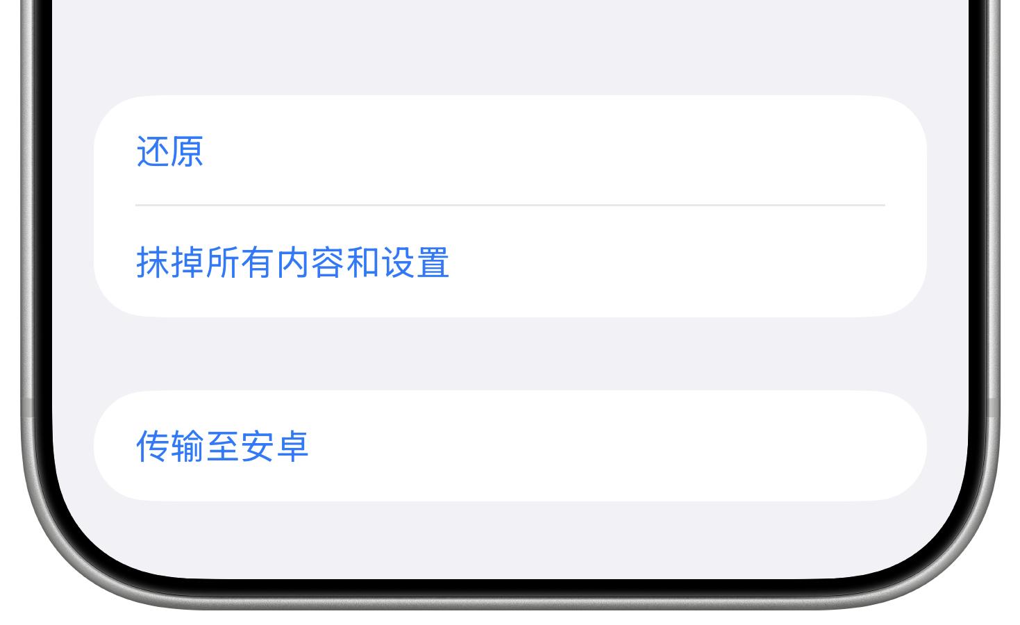 新增「传输至安卓」功能在 iOS 26.3 Beta 1 中,进入「设置 → 通用 → 传输或还原 iPhone」,可以看到新增了「传输至安卓」的入口。这意味着,苹果正在为从 iPhone 换用安卓手机的用户,提供一个原生、系统级的数据迁移方案。
