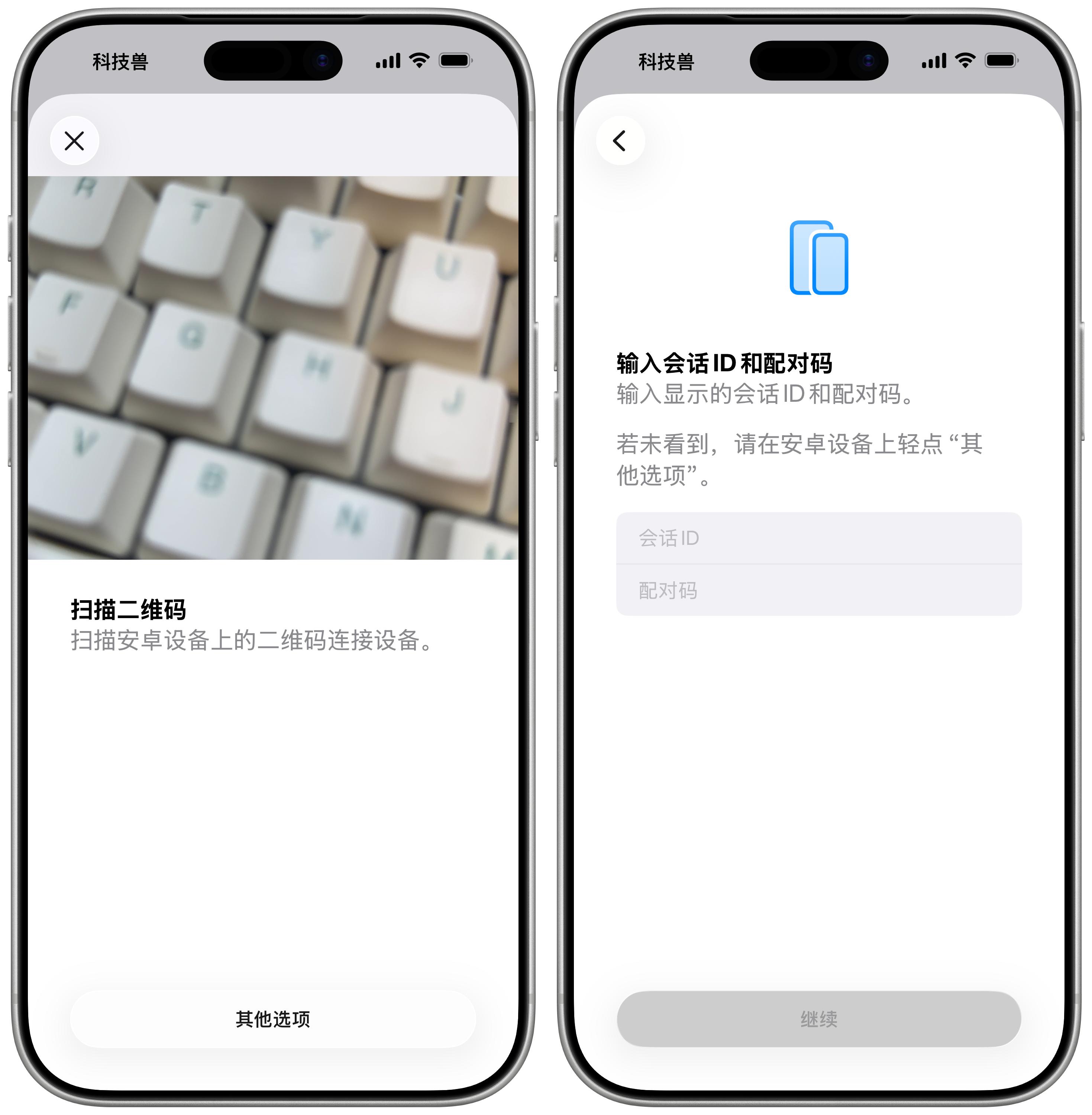 在连接方式上,iPhone 提供了两种配对方案:一是扫描安卓设备上显示的二维码,二是手动输入会话 ID 与配对码完成连接,实现无线数据传输。