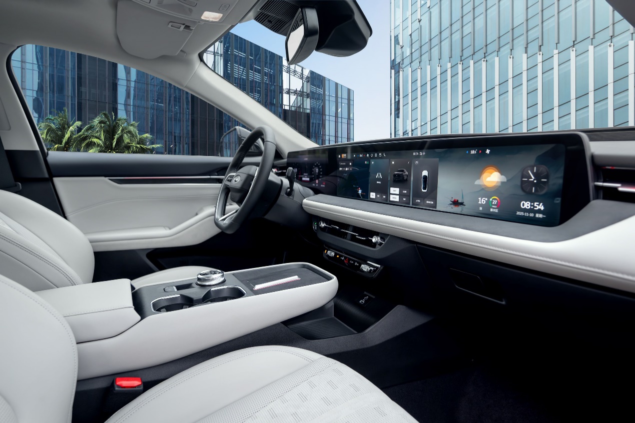 细节上新增“赤霞红”与“沧海蓝”车色,前大灯内置三条错落灯带,搭配“Ford LED”烫印,提升科技感。车尾则融入经典“三柱型”尾灯,立体错层设计极具辨识度。内饰方面,环抱式座舱灵感源自机翼轮廓,中央扶手区借鉴游艇悬浮设计,配合1.1米27英寸4K大屏与高品质软包覆,营造出豪华与舒适兼备的智慧座舱氛围。