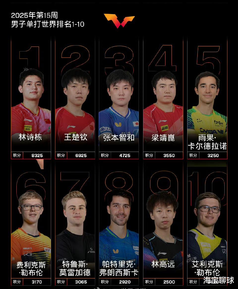 从以上的积分排名可以看出,林诗栋依旧占据世界第一的位置。不过林诗栋和王楚钦的积分差距不大。即将在4月14日举办的澳门单打世界杯男单冠军将获得2000积分,林诗栋和王楚钦势必会对冠军发起冲击,两人不管谁能拿到冠军,都将甩开第二名。林诗栋能不能保住世界第一的位置,王楚钦能不能超越这位小师弟重回榜首,球迷们拭目以待。