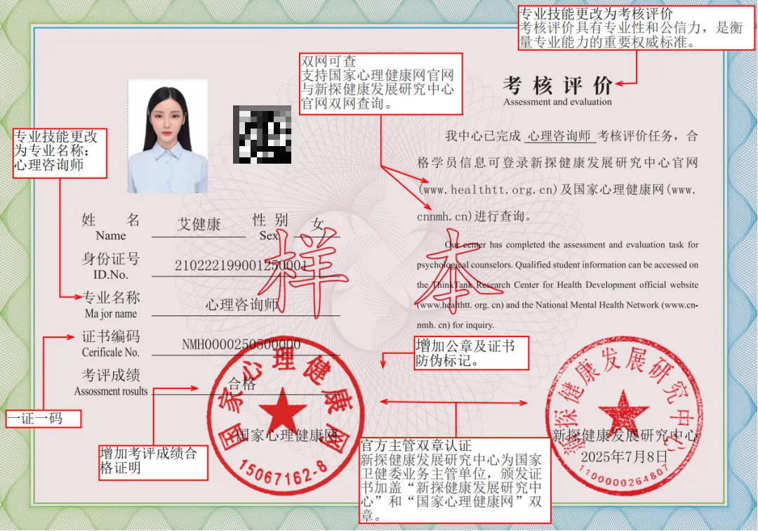 证书查询:证书信息可在新探健康发展研究中心官网或国家心理健康网进行查询验证