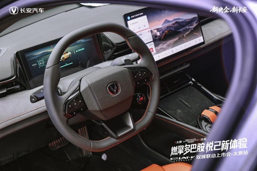 年轻用户对个性的追求并不局限于外在,他们还渴望一个能与驾驶激情共鸣、不仅更智能而且更好玩的专属座舱。因此第三代UNI-V将赛车的环抱座舱复制到内饰空间,并搭载多项智能科技配置,打造了每次出行都更有趣的“超智座舱”。