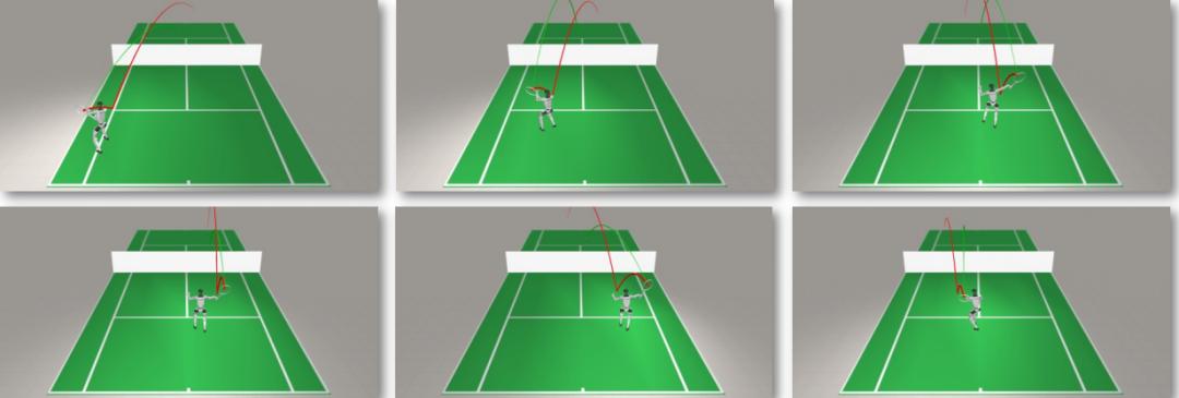 一般来说,真实网球运动中,球速往往在 15-30 m/s 之间,球场空间宽阔,球与球拍的接触时间仅仅只有极短的几毫秒。人们很难采到完整、精确的人体网球动作数据。真实场景中,往往球从四面八方来,也让预设程序的方式无法实现。