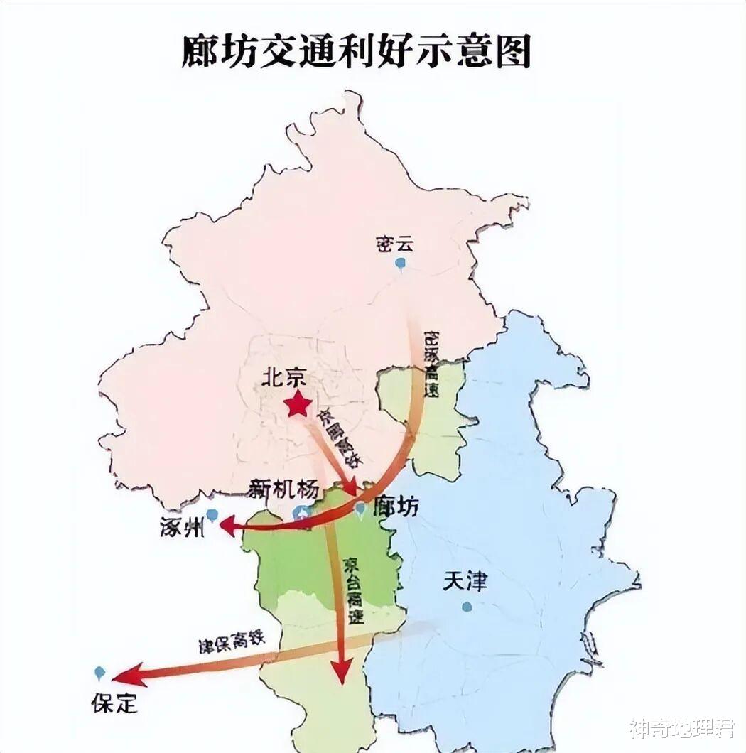 为啥会出现这种 “奇怪地形”?答案藏在行政区划的变迁里。很多人以为京津自古就是直辖市,其实直到 1967 年天津才恢复直辖身份,而北京的通州、顺义等区县,也是后来从河北划入的。简单说,当年划定京津边界时,是按 “区县切块” 的方式操作,没被划走的河北县域就留了下来,形成如今的 “京津走廊”。打个比方,就像切蛋糕时特意留出的一块,不是 “多出来的”,而是 “特意剩下的”。有地理博主算过,廊坊到北京天安门仅40 公里,到天津城区60 公里,到雄安新区80 公里,恰好卡在三大核心区域的 “黄金三角” 中心,这种区位全国独一份。