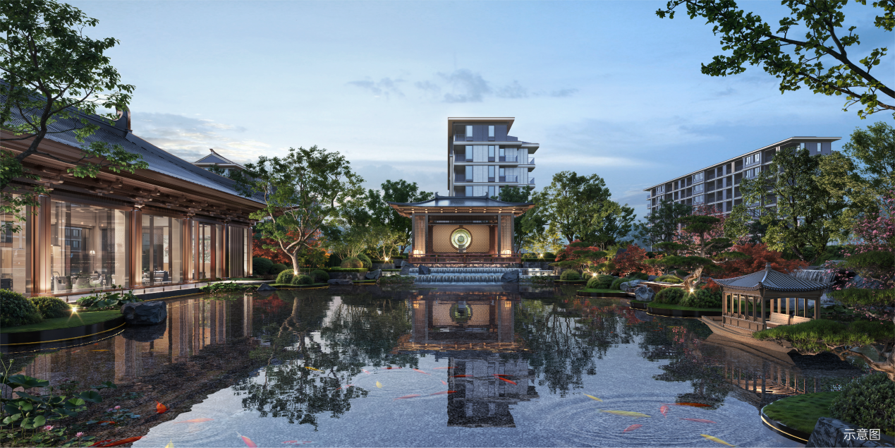 依托一期唐风建筑、园林的成功实践经验,北京国贤府贰期沿袭大明宫的建筑规制,以“丹凤门-含元殿-太液池”的中轴规划营造盛世礼制之美:府门取样大明宫丹凤门,展现“九五之尊”的盛世威仪;归家大堂以含元殿为灵感,让唐制建筑焕发当代美感;建筑立面沿袭传统九脊殿的屋脊形式,彰显屋面礼制秩序;大明宫皇家园林太液池的精髓“一池三山”,也在贰期生动复刻。