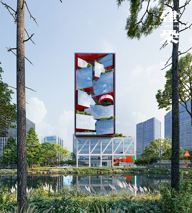 面对三面紧邻的城市建筑群,它选择以谦和的形态融入既有环境;而朝向河道与开阔城市的一侧,则被大胆地拆解、扭转,形成层层叠落的露台、悬挑与间隙,仿佛一片突然从规整城市肌理中“生长”出来的立体森林。