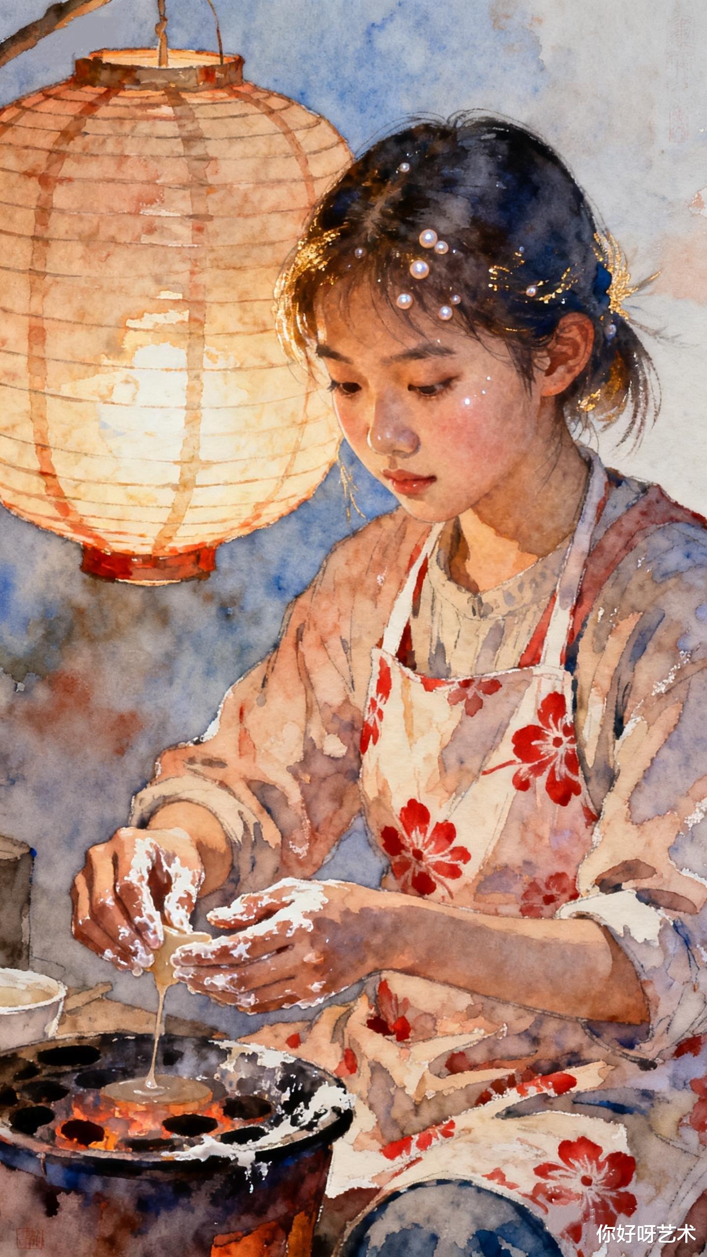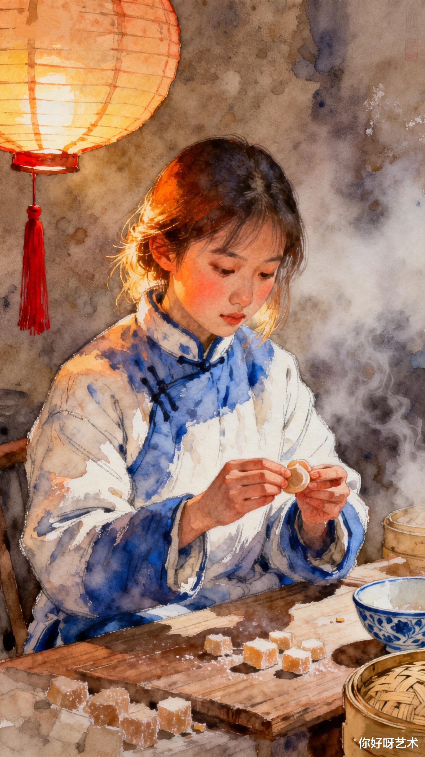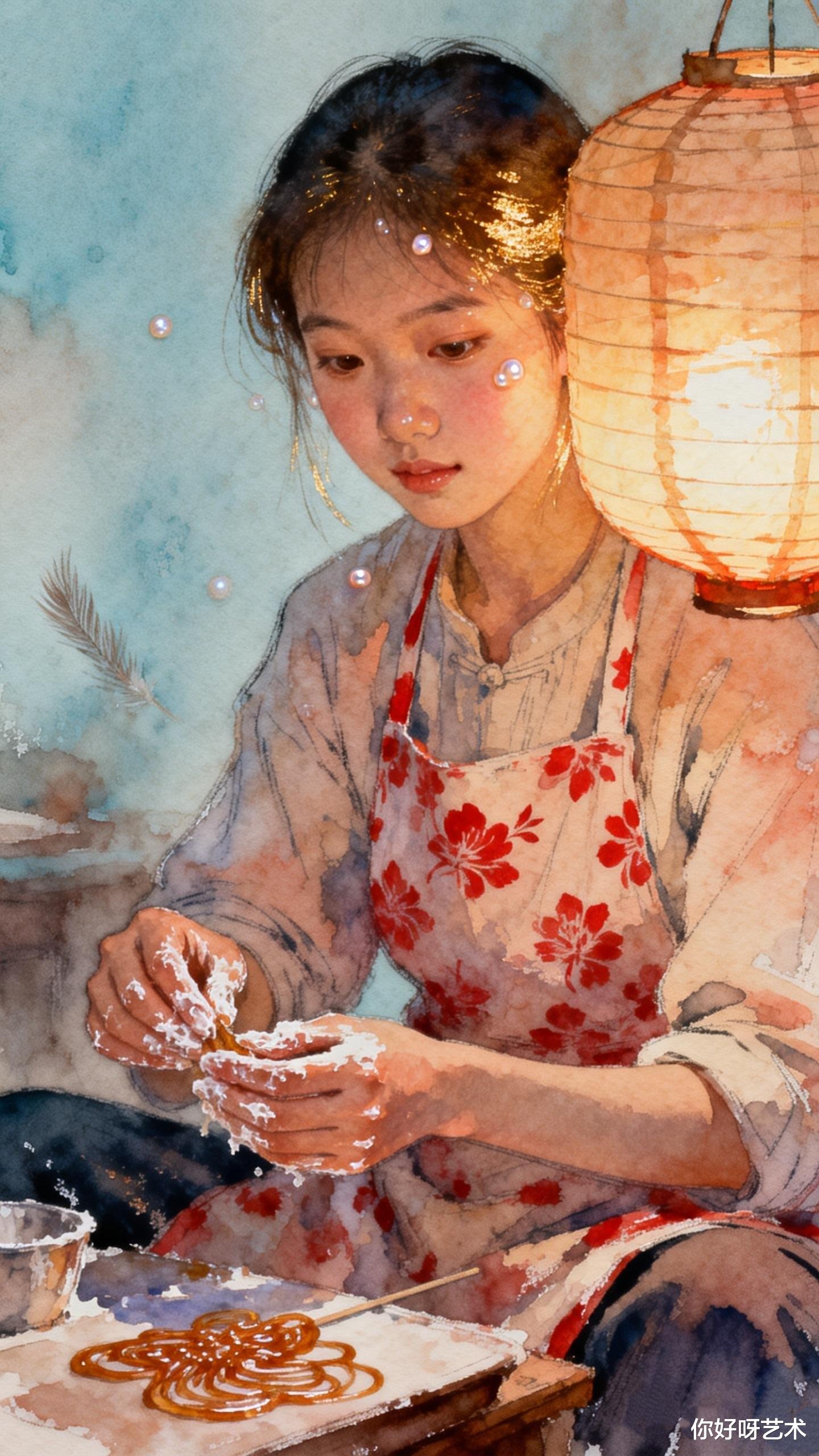 “今日要熬灶糖。”小葵对着铜镜系上靛蓝围裙,发梢别着的银簪是母亲所赠,随着动作在晨光里闪出细碎的光。她总爱在围裙上别一支新折的梅枝,说是“把春天别在糖锅边”。灶台上的铁锅已烧得滚烫,小葵将泡发的麦芽轻轻倒入锅中,豆汁顺着石槽流下,汇入木桶中。水彩的颜料盒就搁在灶台边,钴蓝、赭石、朱砂在瓷碟里晕开,像把整个冬天的色彩都揉进了糖浆里。