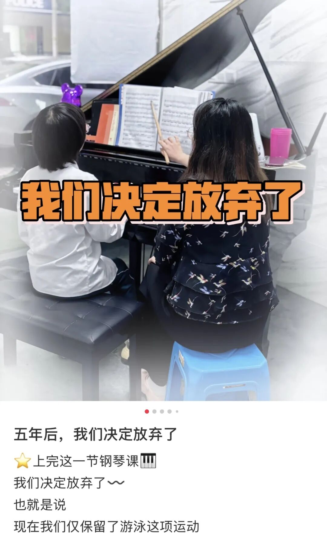 还有孩子学了五年钢琴,在钢琴课用完的那一刻,当即决定放弃,不再坚持。面对孩子的选择,家长却松了一口气,表示:“庆幸自己及时止损。
