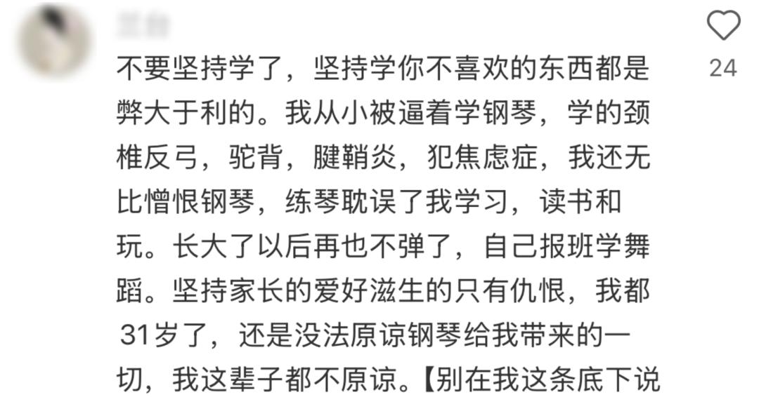 当我们翻开社交平台,可以看到许多家长都在分享放弃学琴的帖子:有小孩从幼儿园大班开始练琴,煎熬四年后颓然放弃,那一刻,家长与孩子都仿佛解脱似的;