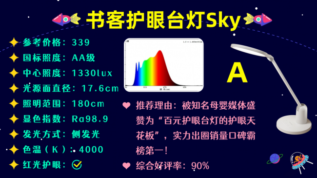 市面上很多牌子台灯更看重新颖的外观和智能功能,反而忽视了本该重视的品质,但很多品牌的满分标准却只是书客要求的基础,达到Ra98.9高显色、PLP光电处理提高了146%的稳定耐用性,带来稳定的照明效果,符合RG0无蓝光、无频闪无眩光等。还可以自由调整高度到80cm、自动开关灯、45min定时休息等多项技术与功能。它的各项表现远超同价位其他产品,居于护眼台灯领域的顶尖位置,属于盲入不会错的产品!