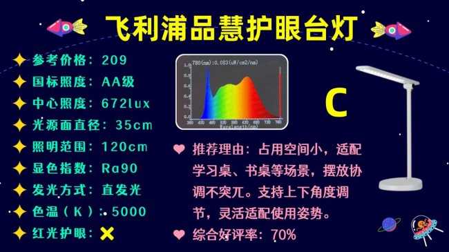 十大护眼台灯品牌排行榜前十名有哪些?第十名是飞利浦品慧护眼台灯,它采用一体式立杆结构,灯头和灯杆均可大角度自由转动,灯杆为可调节单杆设计,能灵活调整照明角度,摆放位置灵活便捷。照明方面,这款台灯配备35cm矩形光源面,采用直发光设计,光线相对集中,照明范围约为120cm,能满足常规书桌的日常照明需求。它的中心亮度为672lux,刚好达到基础照明标准,近距离使用时基本够用,但直发光设计容易在光滑书面产生反光。