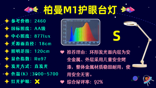 十大护眼台灯品牌排行榜前十名有哪些?第二名是柏曼M1护眼台灯,它在光效表现上,它的显色指数高达Ra97,色彩还原度出色,能真实呈现物体原本色彩,同时色温支持3000K-5700K无级调节,还能灵活进行无极调光,可根据不同环境光和使用场景精准适配光线。光源技术方面,蓝光峰值在0.8附近,相对温和,护眼表现较为稳妥。而且作为直发光台灯,它做了环形发光面优化,能多方向扩散光线,光线柔和度比一般的直发光台灯要好。
