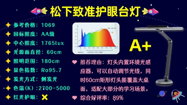十大护眼台灯品牌排行榜前十名有哪些?第四名是松下致准护眼台灯,采用侧发光方式,搭配直径60cm的大面积光源面,中心照度可达1765lux,可覆盖约180cm的书桌,即便大桌面也能实现宽广照明。色温可在2700K暖黄光至5000K冷白光之间自由调节,适应夜读、日间学习等多种场景。此外,灯头配备触控操作面板,轻触即可在阅读模式和工作模式间切换,同时支持智能调光、入座感应及定时休息功能,能自动调节亮度并提醒合理用眼,延时关灯也方便睡前使用,操作便捷。