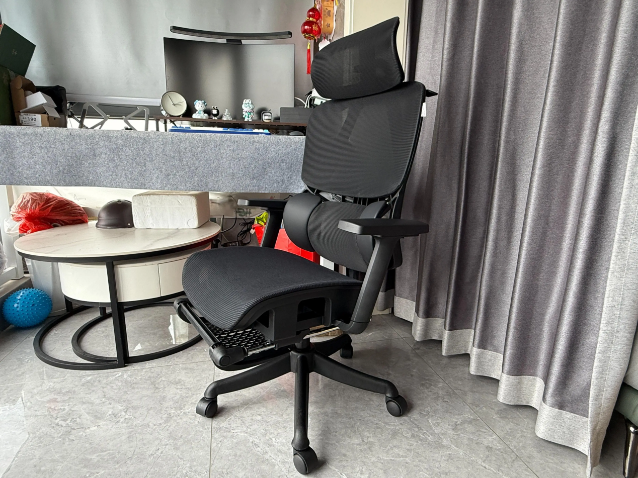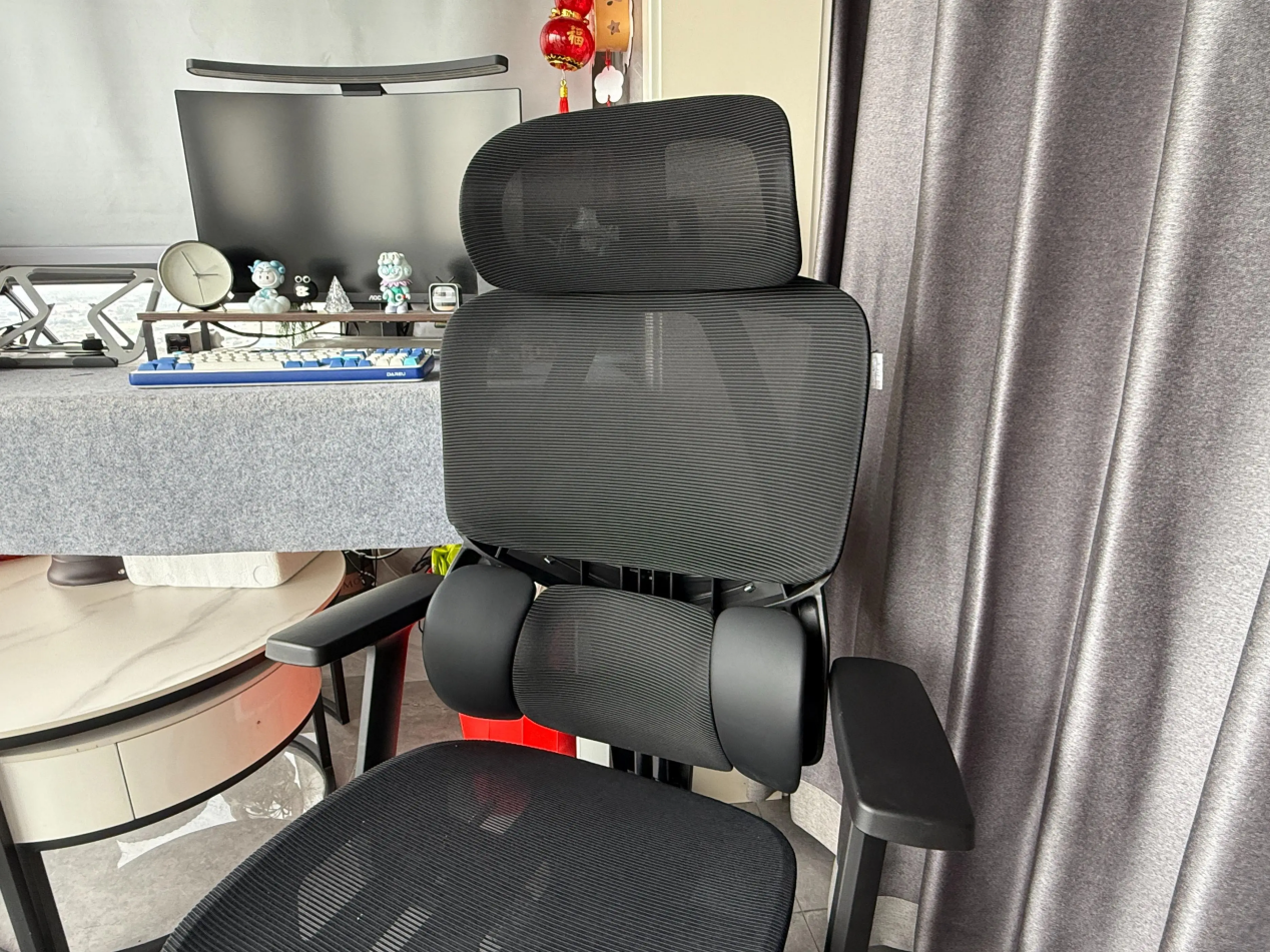 整体支撑更偏向包裹感而不是硬撑。椅背弹性不错,身体靠上去会有一定回弹,但不会塌。前倾功能对长时间伏案的人很友好,身体前移时背部依然有支撑,不容易含胸塌腰。坐垫对大腿的承托比较均匀,边缘不硌腿,长时间坐着血液循环压力不大。不过因为整体设计偏轻盈,面对高个子或体重偏大的用户,稳定感会稍逊一筹。
