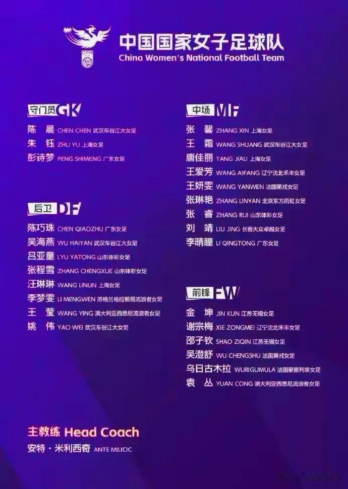 本次中国女足亚洲杯最终的26人大名单中,四年前立下汗马功劳的球员王珊珊、王晓雪、娄佳惠、肖裕仪等都已经不在队中,仅剩下张睿、王霜、唐佳丽、朱钰、张馨、姚伟等老将,而37岁的张睿依然是中国女足的节拍器,最年轻的球员是20岁的王爱芳和谢宗梅。