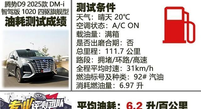 下面咱们来进行馈电油耗测试,驾驶方法和空调还是老样子不动,就是能源换成HEV模式。刚加满油启程时,电量显示16%,跑完104.5公里回到加油站,电量居然涨到了20%。这一路上,平均速度大概31公里每小时,加油加了6.97升。然后,咱们又用纯电模式把那4%的电量差距给补上,又多跑了7.2公里。这么算下来,百公里油耗才6.2升,这表现真的挺棒的!要知道,24款在冬天低温测试时,馈电油耗可是7.94升每百公里,这次提升真的太明显了!对了,腾势D9这车加92号油就行,简单又省钱,真的是省油高手,没话说!
