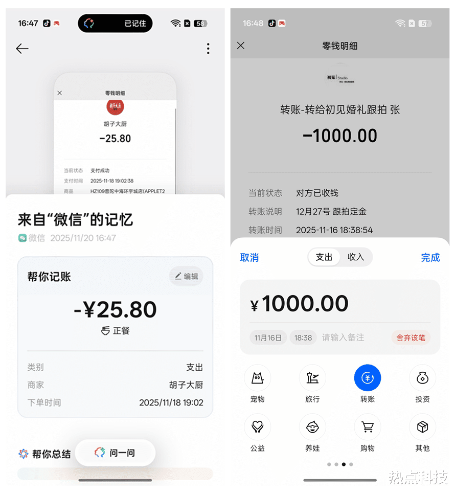 还有一个我觉得很适合用来记账的小布记忆,以往记账可能需要打开记账软件、输入金额、花费的内容,比较繁琐,但是现在只需要“三指上滑”就可以直接记住当前的页面内容,金额、花费类型都记得明明白白,在小布记忆APP中可以查看到我的账单。