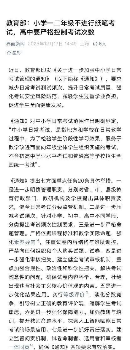 教育部:小学一二年级不进行纸笔考试,高中要严格控制考试次数