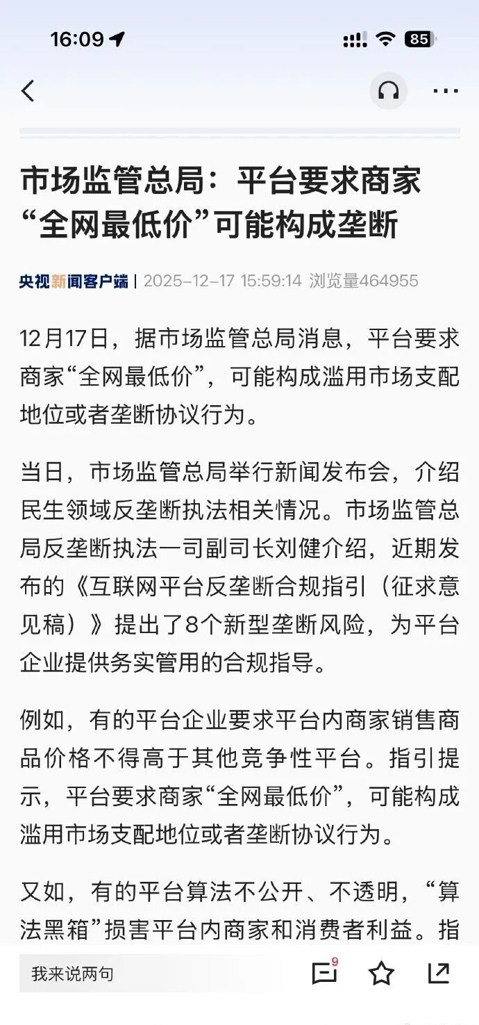 市场监管总局:平台要求商家“全网最低价”可能构成垄断