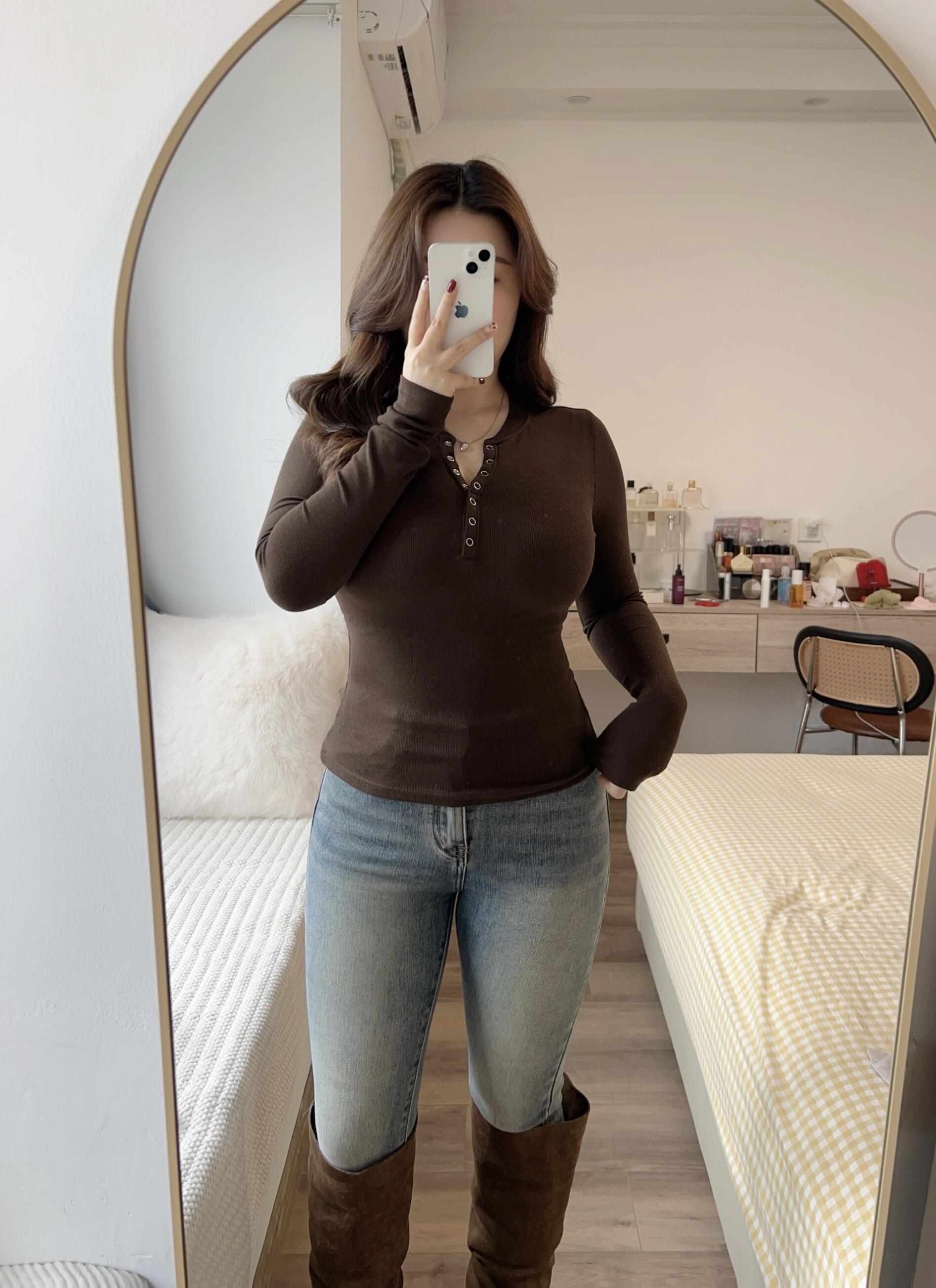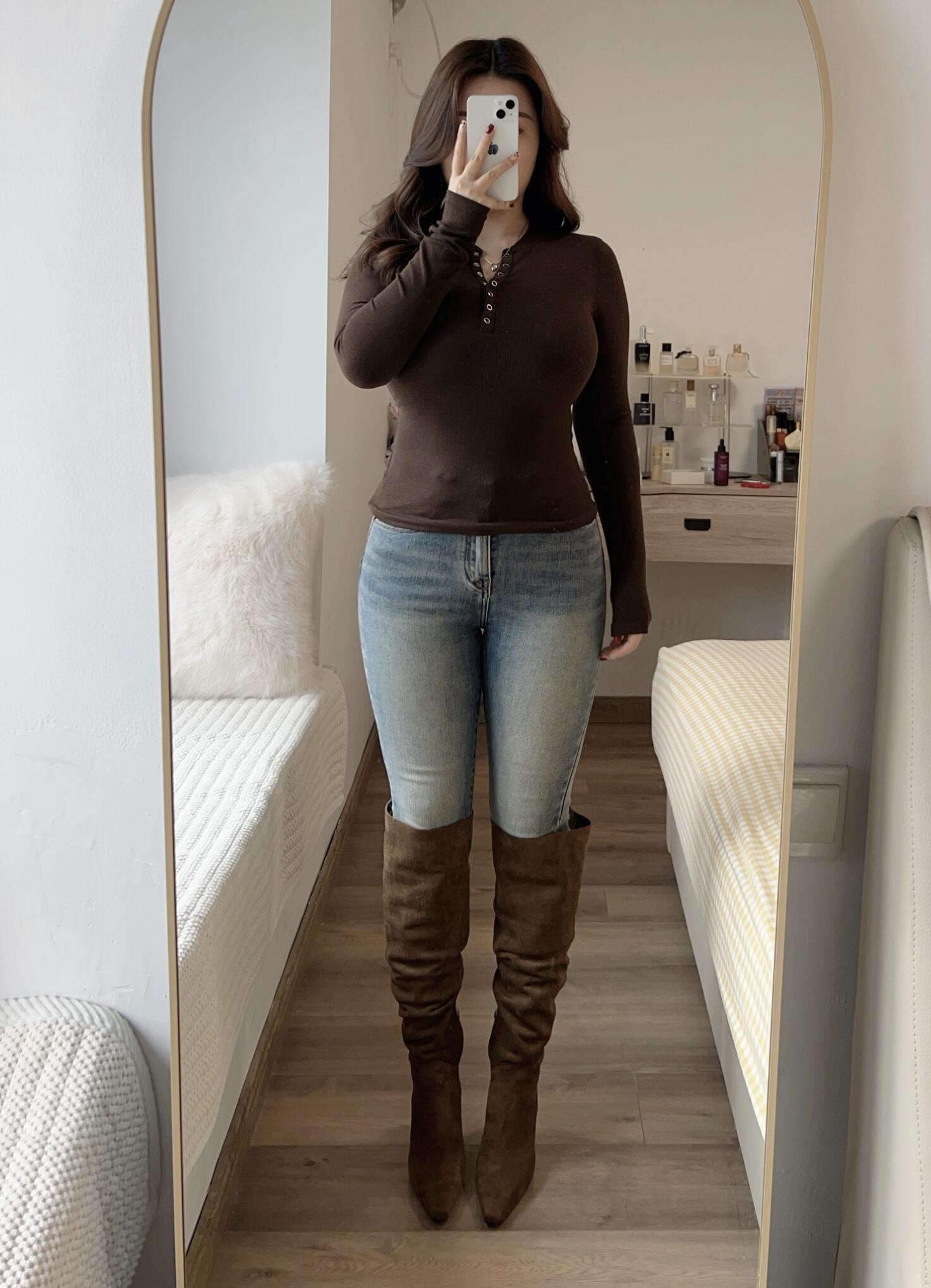 身穿深棕色V领长袖上衣和浅蓝色修身牛仔裤,脚踩一双同色系的深棕色过膝长靴,右手举着白色手机遮住面部进行自拍,妆容精致。她站在房间的全身镜前,背景中可以看到带有白色毛绒抱枕的床铺、摆满护肤品的浅木色梳妆台,以及浅黄色的格纹床品。整体色调温馨柔和,构图重点突出人物的整体穿搭。