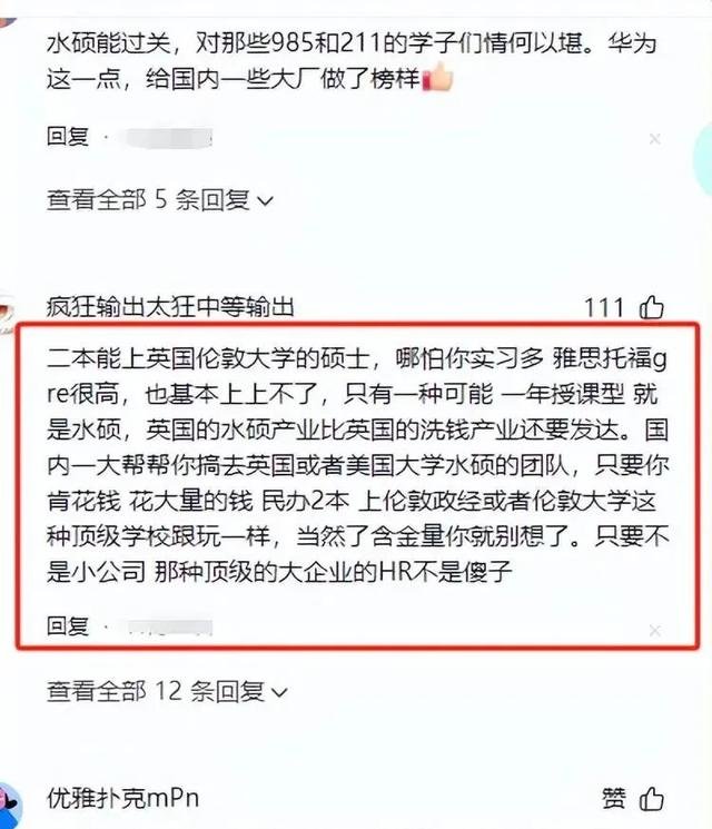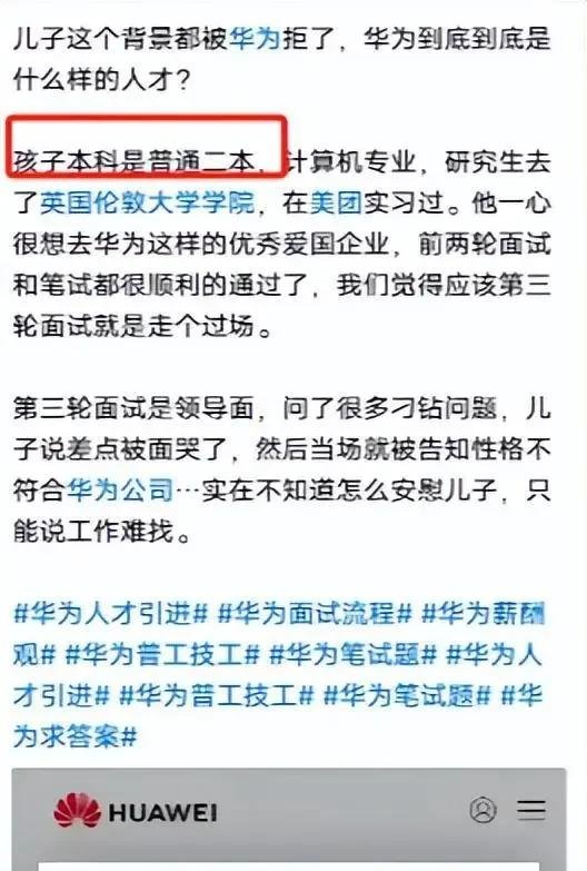 “学历焦虑”这个话题最近又被推上了风口浪尖,原因是一个被母亲晒到网上的求职故事。故事的主角是位海归硕士,研究生毕业于英国伦敦大学学院,履历看起来堪称光鲜亮丽:计算机相关专业、海外高学历、还有国内知名企业的实习经历。他在华为求职的最后一轮面试中却惨遭淘汰。这位母亲愤愤不平地发帖吐槽:“华为凭啥不要我儿子?”但网友只看了他本科的“普通二本”背景,就发现了问题所在。这四个字,直接把她的骄傲击得粉碎,也把这场求职失败的原因暴露得淋漓尽致。