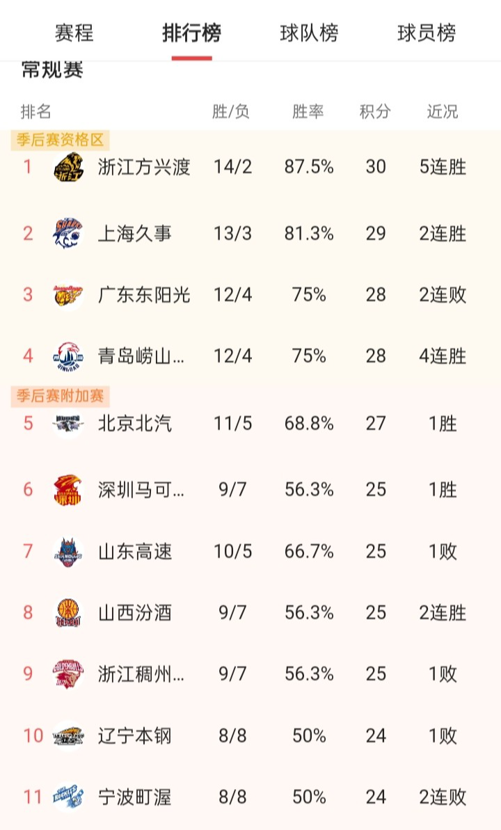 CBA常规赛16轮较量结束,上海迅速调整拿到两连胜,辽宁输给深圳,山西赢福建,天津战胜同曦, CBA积分榜排名更新,广厦稳居首位!