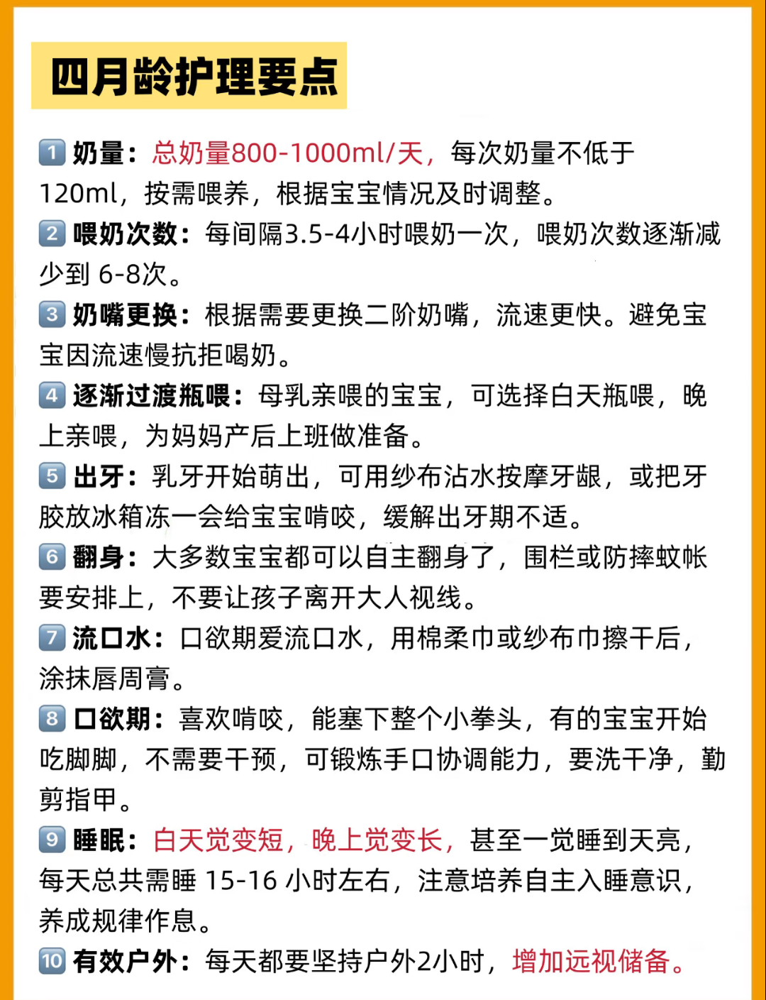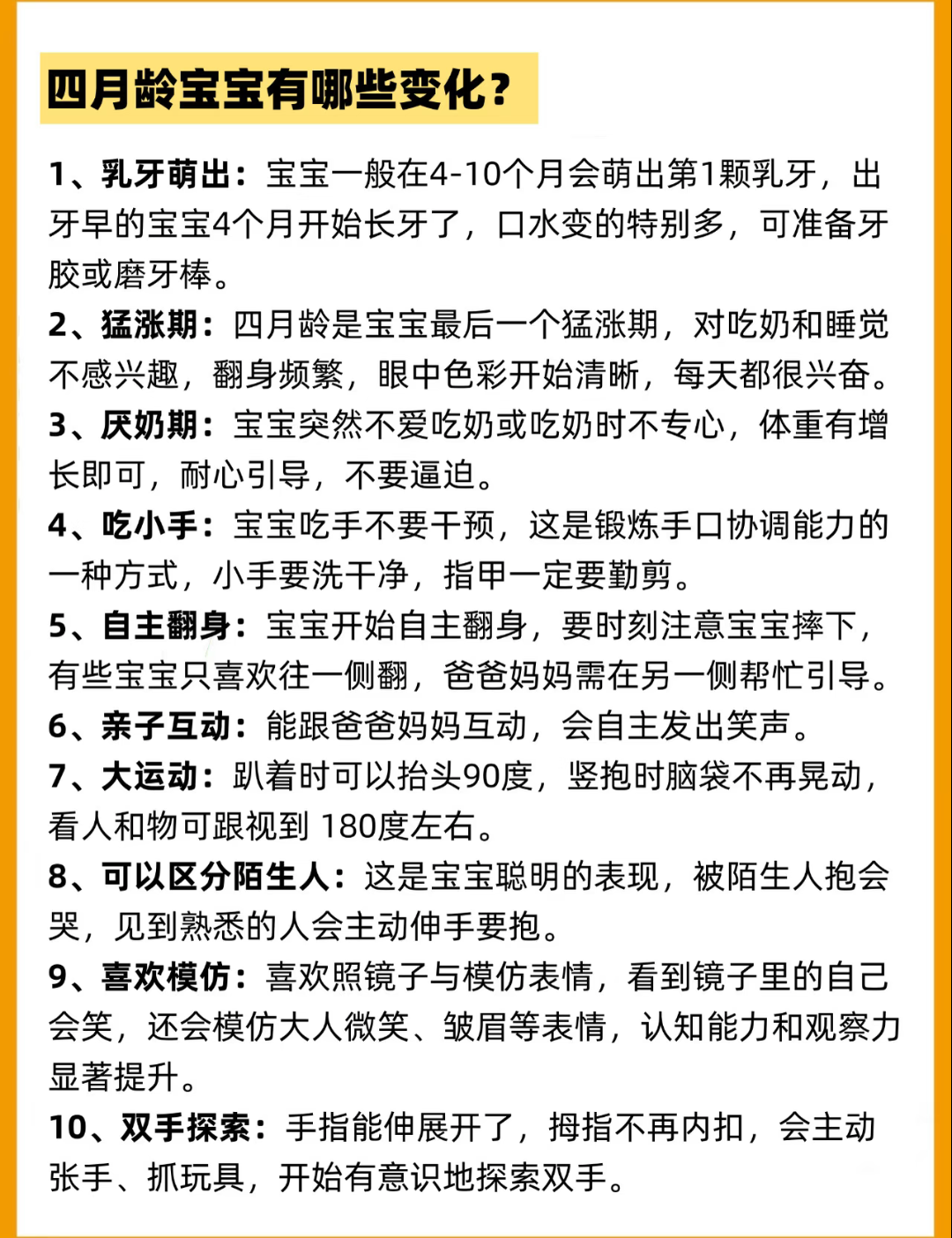 这个月的宝宝就像一块小海绵,每天都在吸收新的东西,每天都在给你新的惊喜。你会忍不住拿出手机拍个不停,生怕错过任何一个瞬间。那些熬夜喂奶的辛苦,那些抱着他走来走去的腰酸背痛,在他冲你笑的那一刻,突然就觉得全都值得了。这就是四月龄的宝宝,一个刚刚开始真正认识你、爱上你、想要跟你互动的小人儿,好好享受这段时光吧,因为接下来的每一天,他都会给你更多意想不到的惊喜。