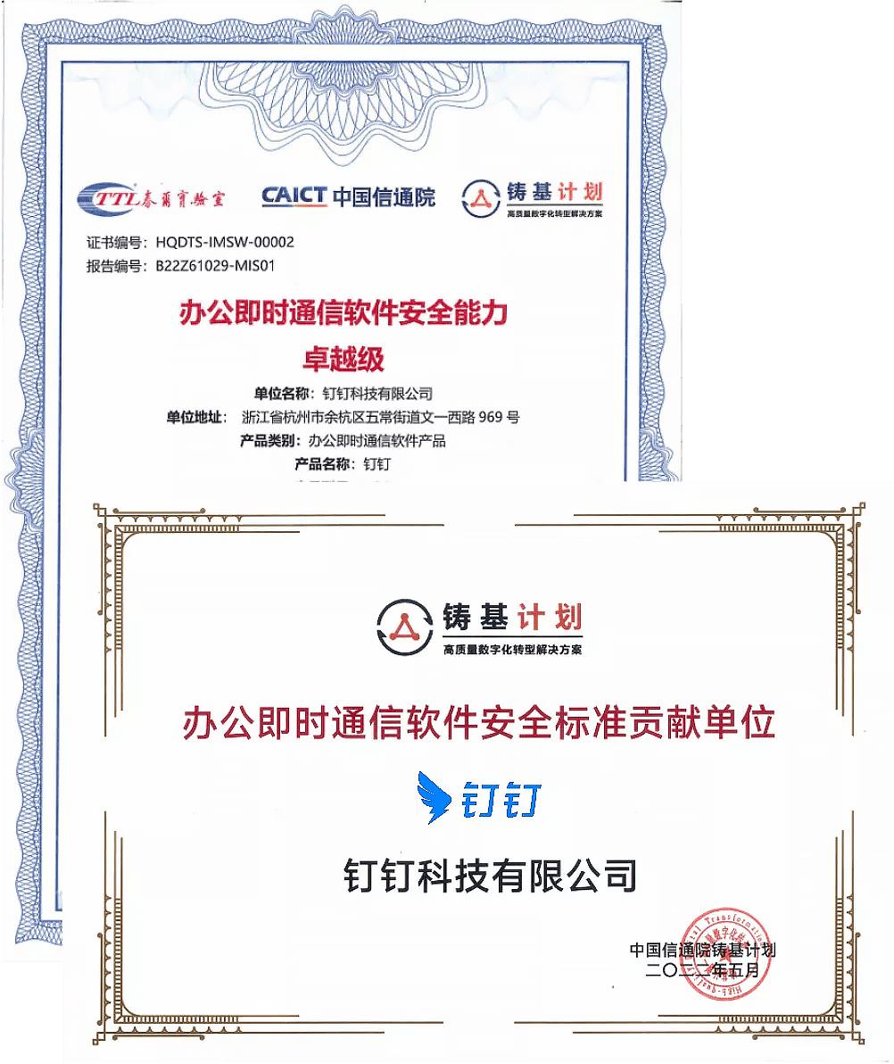 早在2022年,中国信通院“铸基计划”的安全评估中,钉钉就从首批参评产品里脱颖而出,拿下最高安全级别的“卓越级”认证。