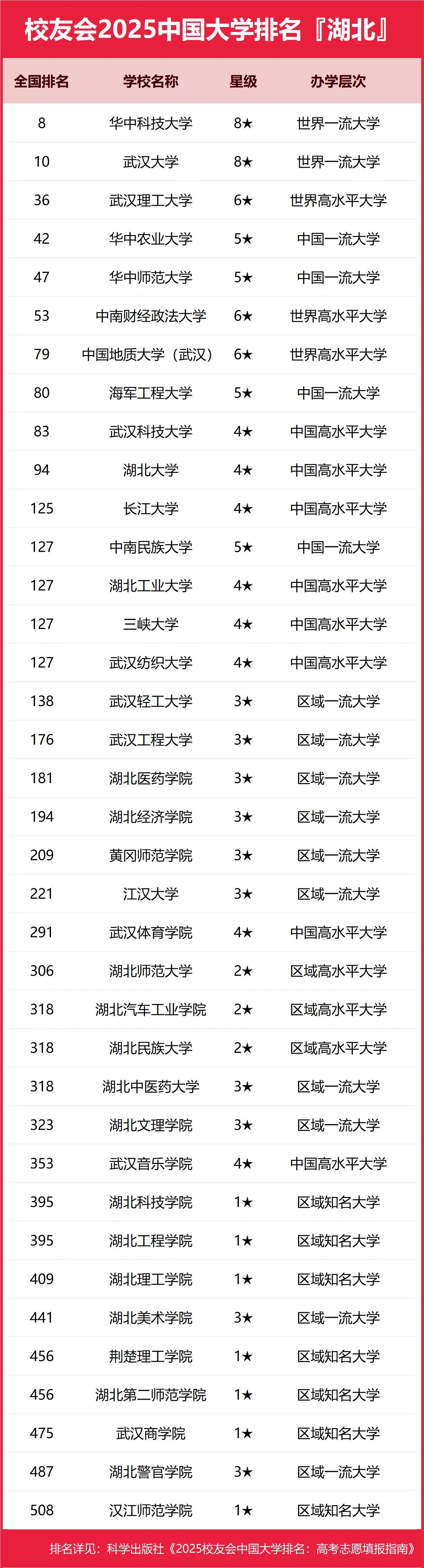 校友会2025中国大学排名正式揭晓,湖北省高校格局呈现多层次发展态势。作为中部教育重镇,武汉"双雄"继续领跑全国,华中科技大学与武汉大学分列全国第8、10位,以世界一流大学之姿稳固教育高地。武汉理工大学(36位)以6星级评价坐稳"第二梯队"龙头,华中农业大学(42位)凭借特色专业保持优势,与之形成三足鼎立之势。引人注目的是,师范类与财经类院校展开激烈角逐,华中师范大学以5星级评价位列全国第47位,与中南财经政法大学(53位)共同构建起文理交融的学术矩阵。军地协同发展特色显著,海军工程大学与武汉科技大学同步进入全国百强,凸显湖北教育的多元生态。