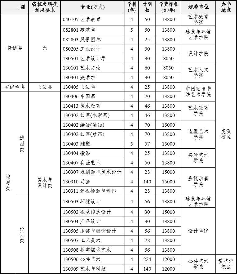 中国画学院、书法学院、油画系、版画系、雕塑系、壁画系、造型学科基础部、实验艺术与科技艺术学院、设计学院、建筑学院、城市设计学院、修复学院学费标准15000元/学年。
