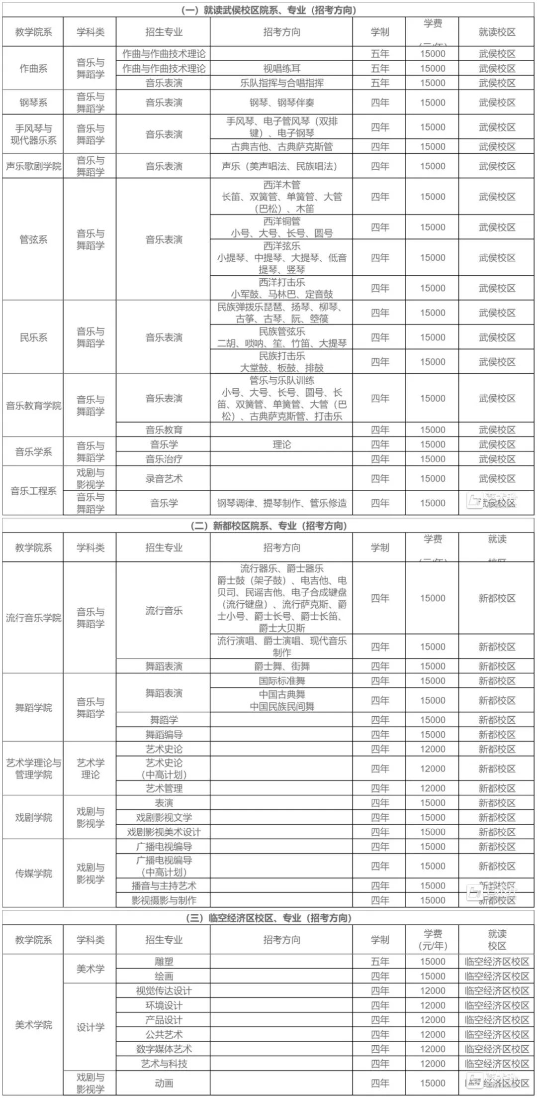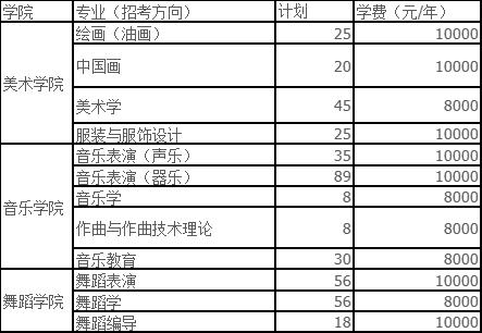 音乐学(音乐学理论、钢琴调律)、作曲与作曲技术理论、录音艺术、音乐表演、音乐教育、音乐治疗、流行音乐、舞蹈表演、舞蹈编导、舞蹈学专业(方向)学费每生15000元/学年;