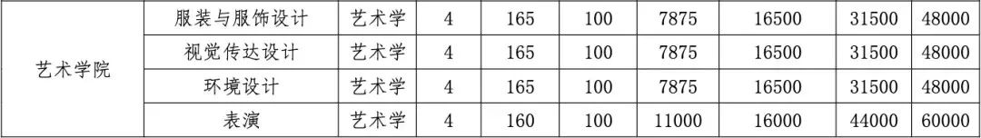 艺术与科技8000元/年;服装与服饰设计、产品设计、视觉传达设计、环境设计、动画、数字媒体艺术、摄影、表演、绘画、中国画、雕塑、公共艺术10000元/年。