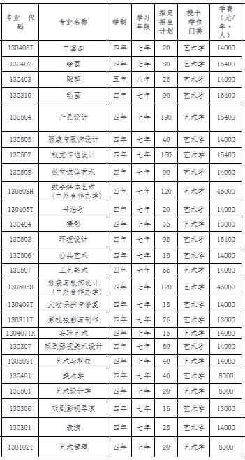 9600元/年:雕塑、陶瓷艺术设计、绘画、产品设计、环境设计、视觉传达设计、动画、公共艺术、数字媒体艺术、美术学、中国画、工艺美术、书法学、艺术教育、实验艺术、艺术设计学、艺术与科技、包装设计等
