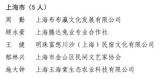 上海玉海棠生态农业科技有限公司、玉海棠景区董事长施大钟;上海布布瀛文化发展有限公司、拾花民宿董事长周勤;长期深耕于乡村文化和旅游领域,凭借对文旅事业的执着,在乡村文化挖掘、旅游资源开发、文旅产业带动乡村振兴等方面做出了卓越成绩。积极探寻本地民俗文化、历史遗迹融入旅游项目中,让乡村有了更浓厚的文化底蕴。