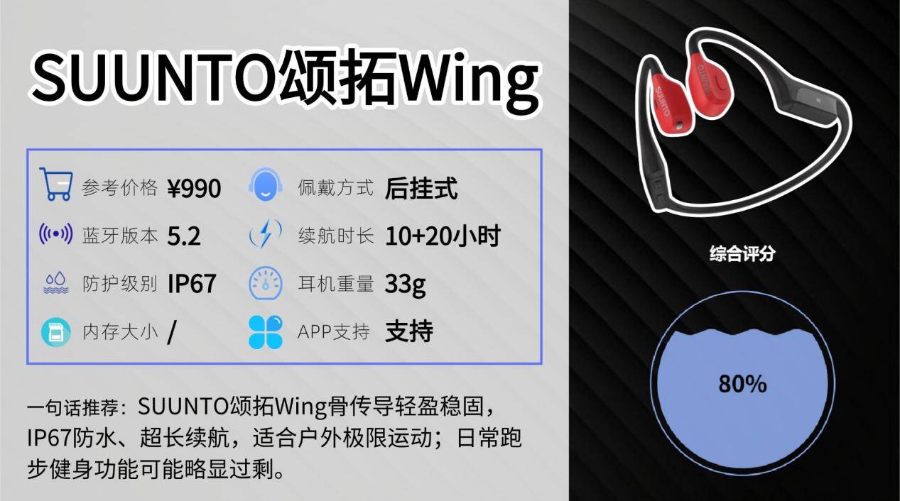 SUUNTO颂拓是专业户外运动品牌,在极限运动和水陆运动耳机领域经验丰富。Wing定位为面向户外极限环境的骨传导耳机,强调稳固佩戴与全天候使用。
