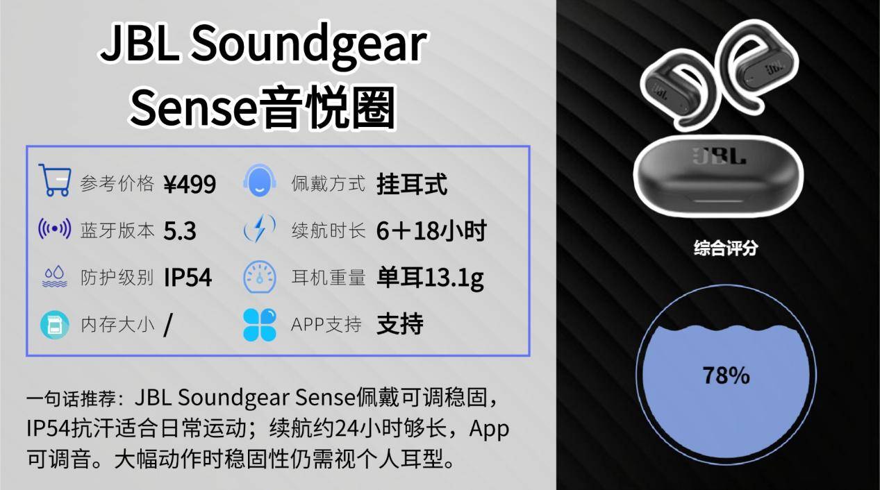 适合跑步、健身、徒步等轻中度运动,佩戴稳固,动作幅度大也不易脱落。IP54防尘防水,能应对汗水或小雨。耳机续航6小时,搭配充电盒总续航可达24小时,全天候运动和日常使用都能满足。综合来看,JBL Soundgear Sense以舒适贴合、稳固防护、全天候续航和定制音效为优势,适合运动与日常兼顾的用户,佩戴自然安全,使用灵活。