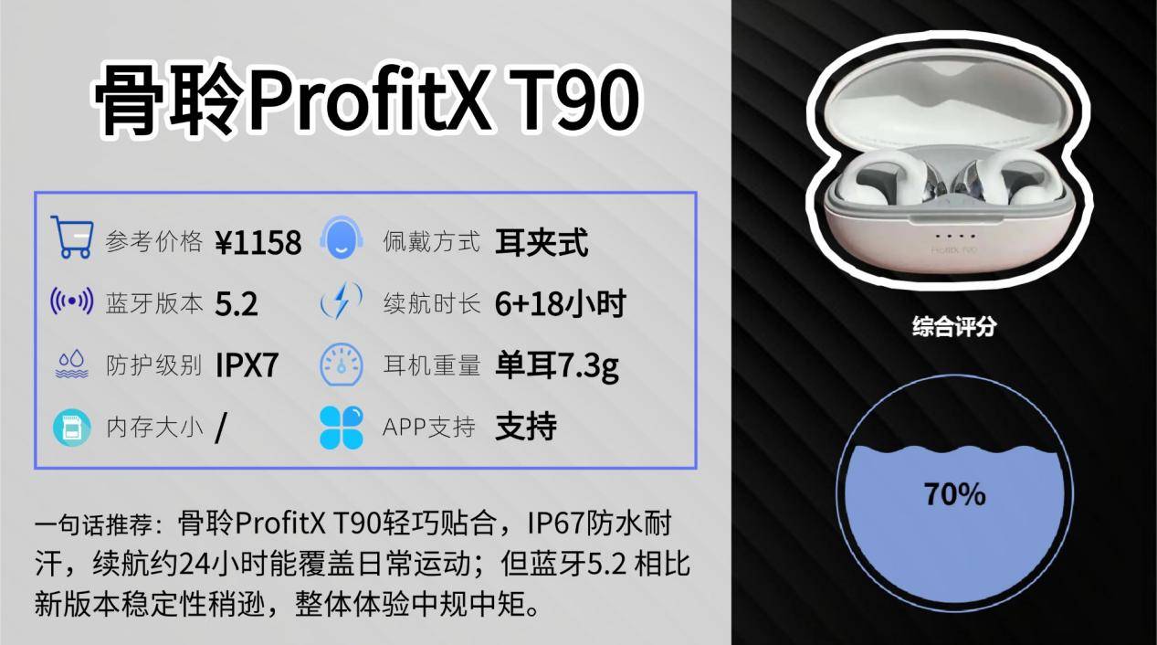 适合跑步、健身、徒步及日常轻中度运动,IP67防尘防水,汗水或小雨不怕。单次续航约6小时,充电仓额外提供18小时,总续航约24小时,支持快速充电,可应对中长时间训练。蓝牙版本为5.2,相比最新5.4稳定性略低,但日常运动仍足够使用。整体来看,骨聆ProfitX T90以超轻舒适、稳固贴合和防护耐用为亮点,是一款适合轻中度运动和长时间佩戴的骨传导耳机。