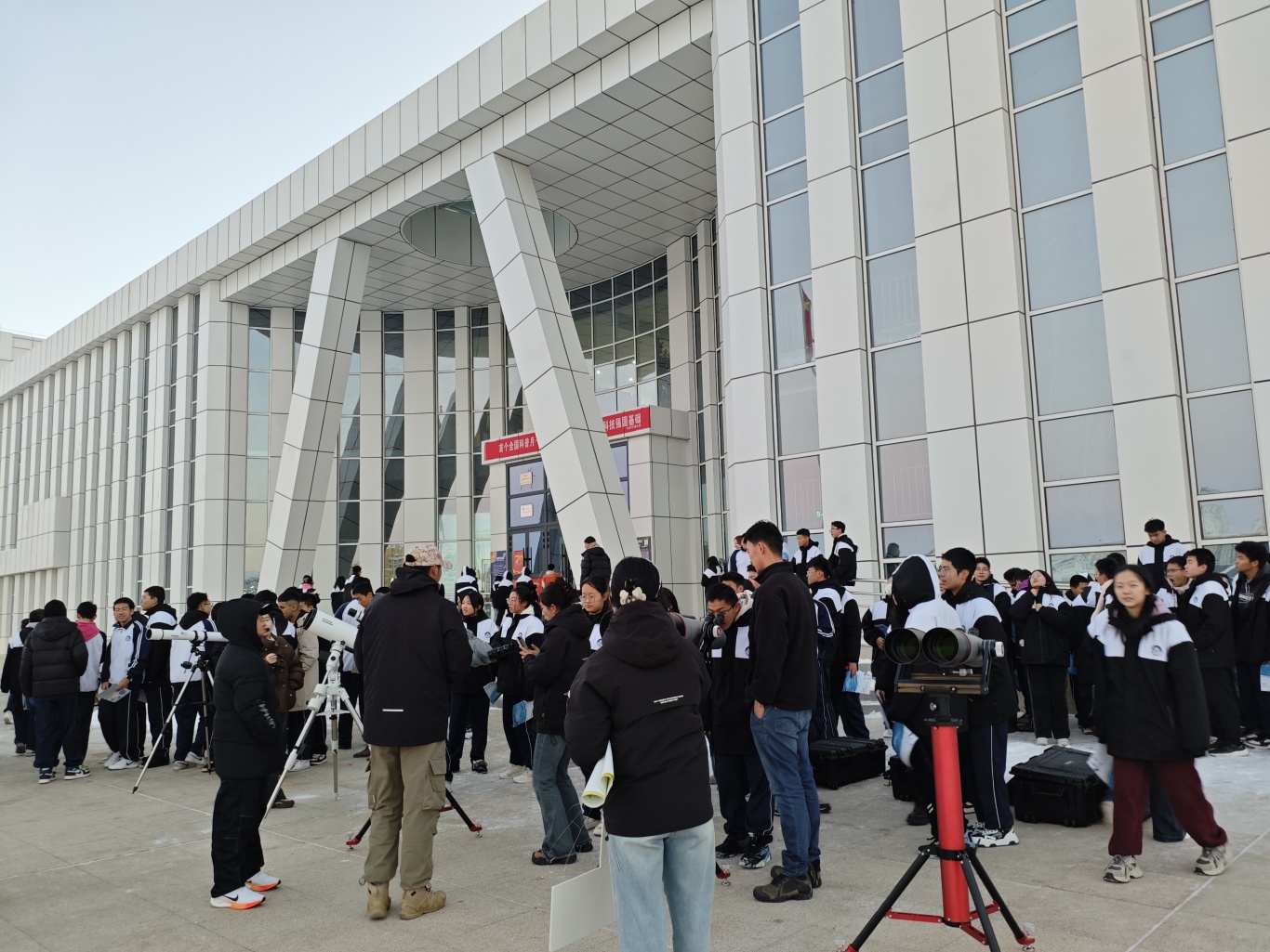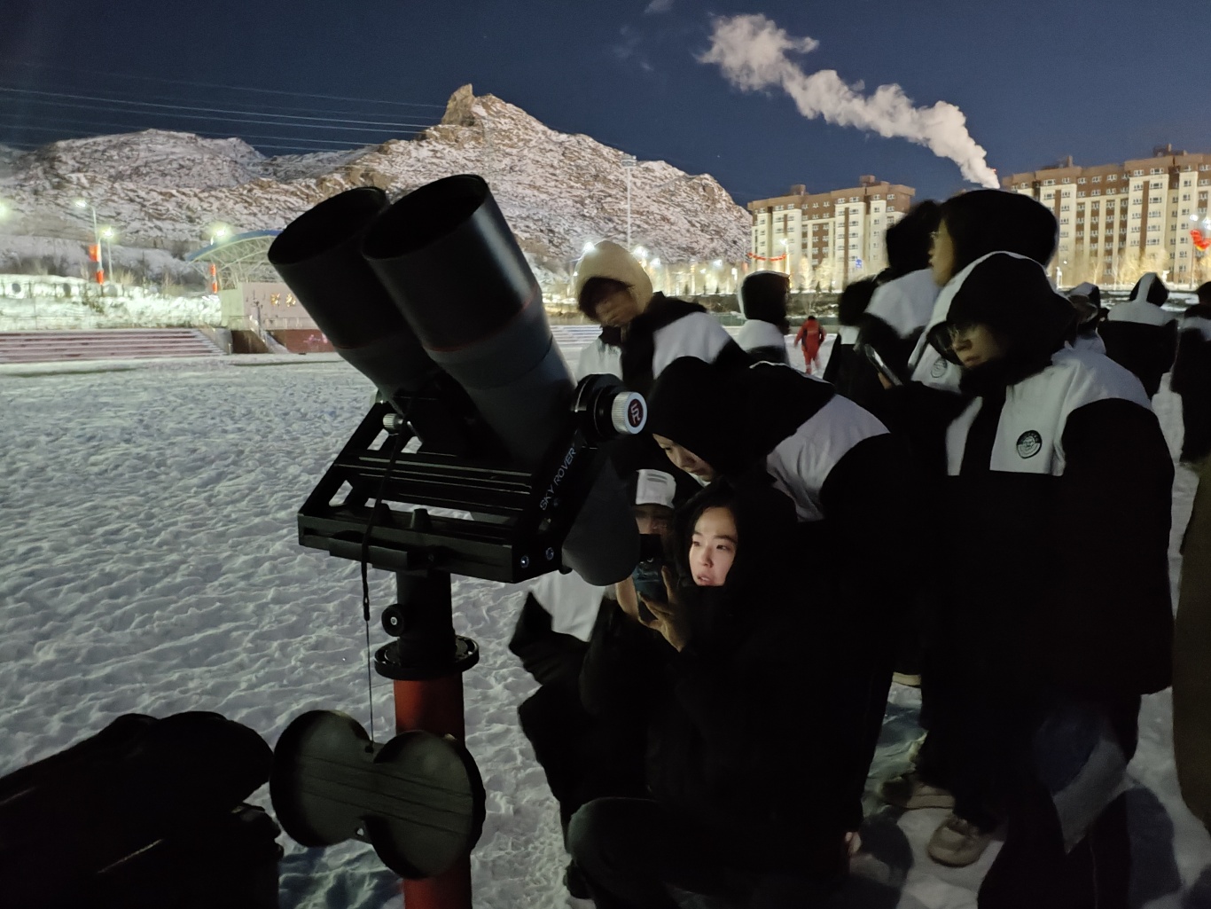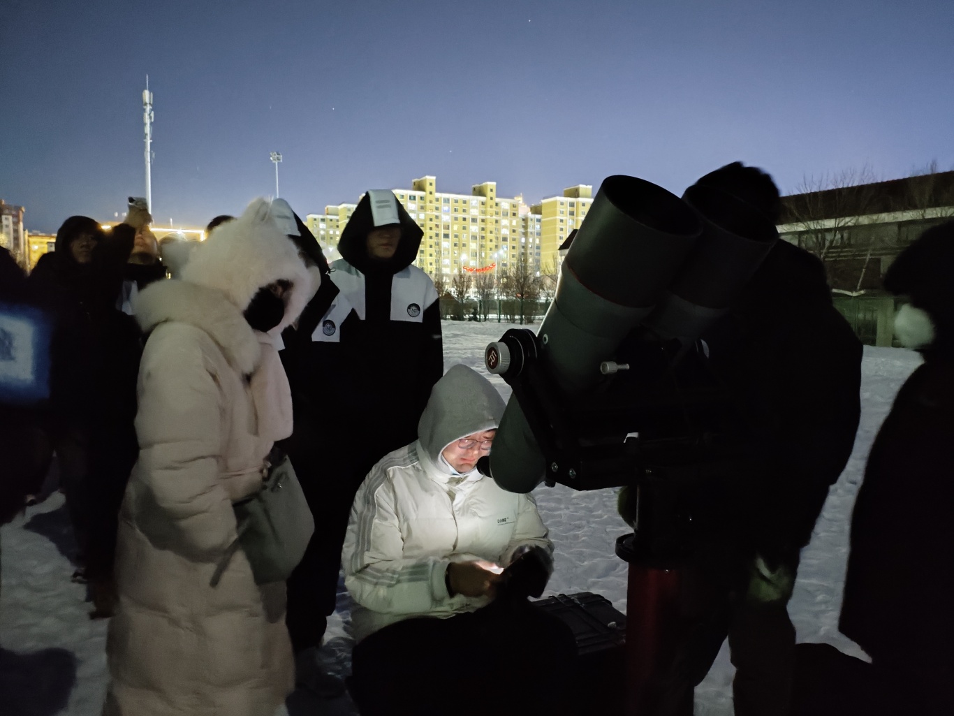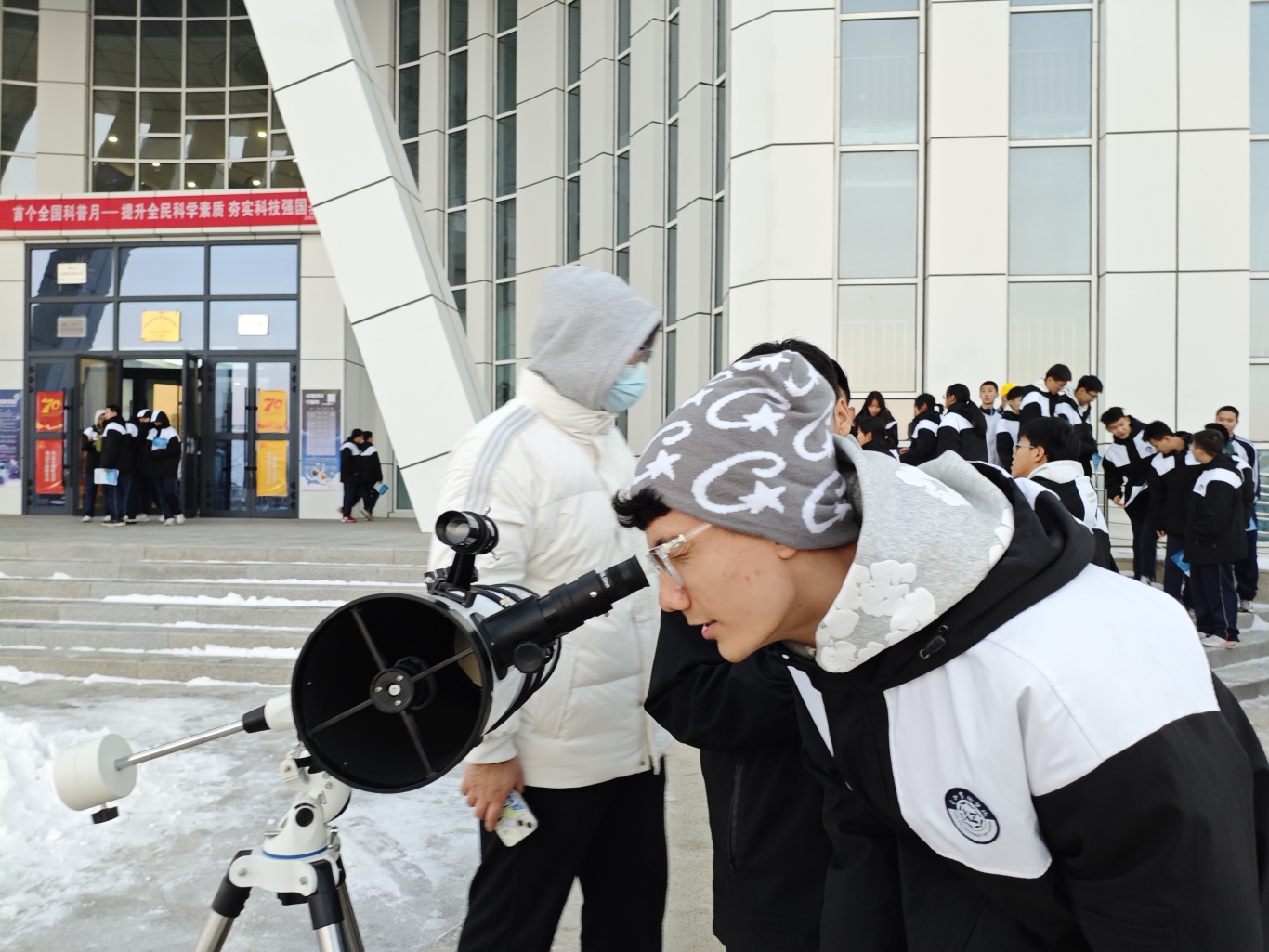 户外观测环节时,虽因天气遗憾错过太阳,却也用专业观测设备对准了阿勒泰的冬日地貌:望远镜镜头里,雪覆的山峦线条、林间挂霜的枝桠清晰可见,孩子们举着手机接在目镜后,把雪域的细腻肌理存成了独特的 “天文馆记忆”。