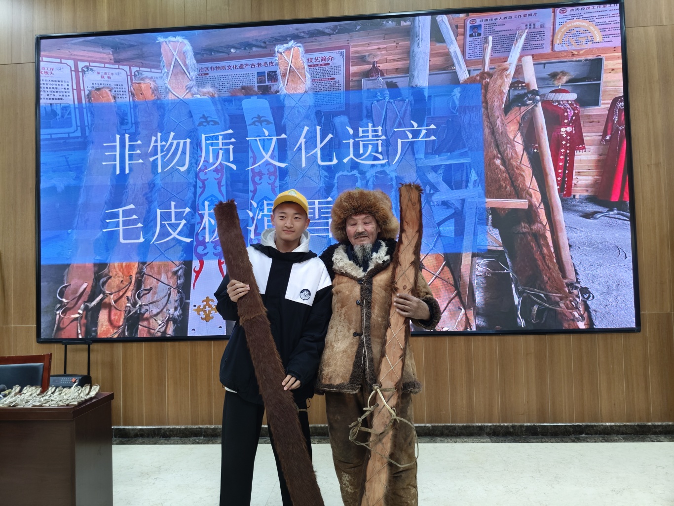 而最动人的莫过于毛皮滑雪板非遗体验。在非遗老师的讲解下,同学们亲手握住这承载着万年智慧的器具,指尖触碰间,仿佛跨越时空与古老滑雪先民完成了一场对话。