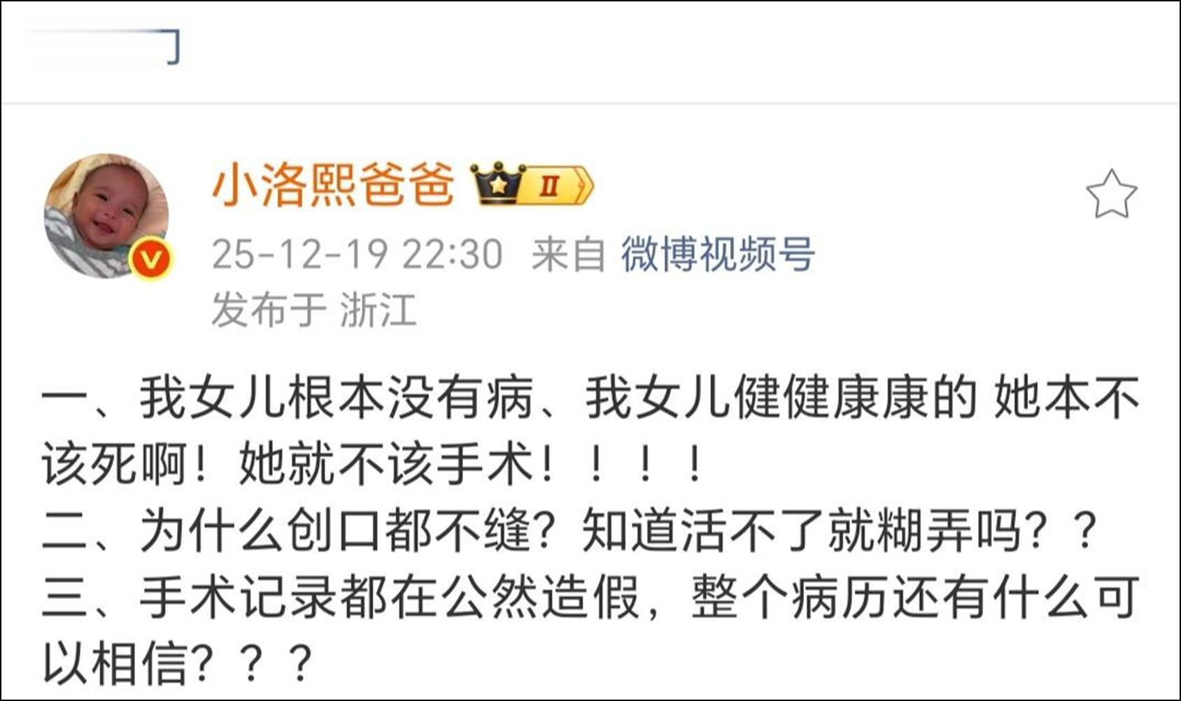 消息一出,舆论哗然,小洛熙父亲发博称:“我女儿根本没有病、我女儿健健康康的,她就不该手术……为什么创口都不缝?手术记录都在公然造假,整个病历还有什么可以相信?”